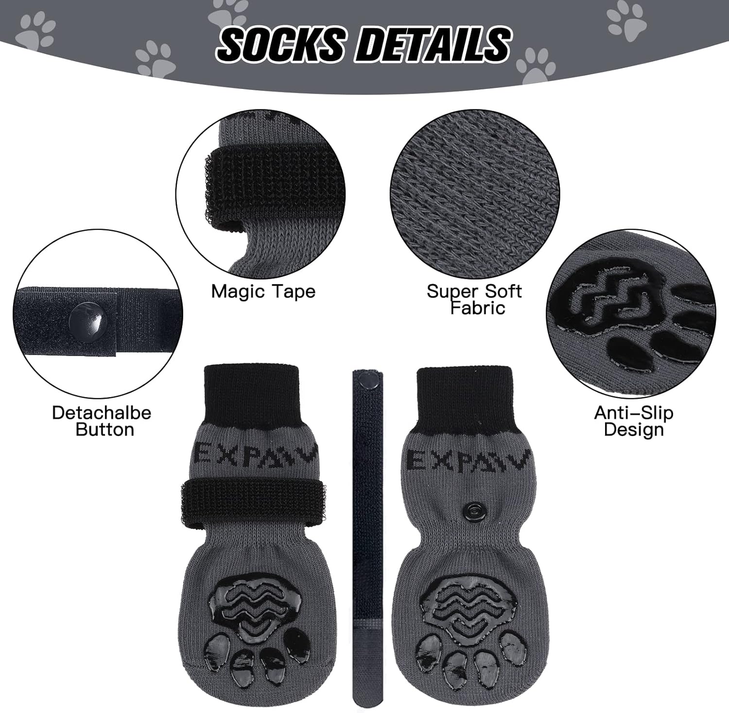 Anti-Falling Design: We adopt an adjustable magic tape design, which can adjust the width and tightness according to the size of your dog's paw. In addition, the tightening design of the tail of the sock also ensures that the sock will fall down during movement or walking.