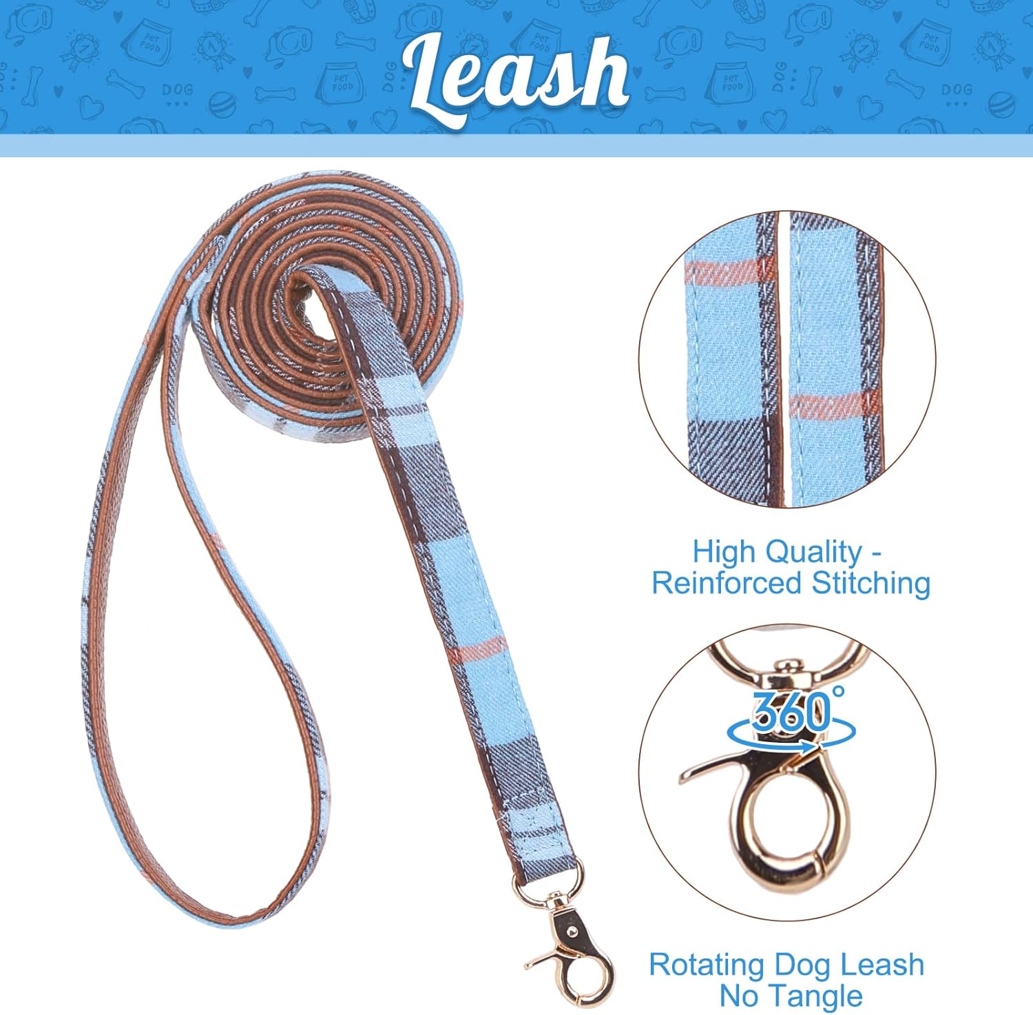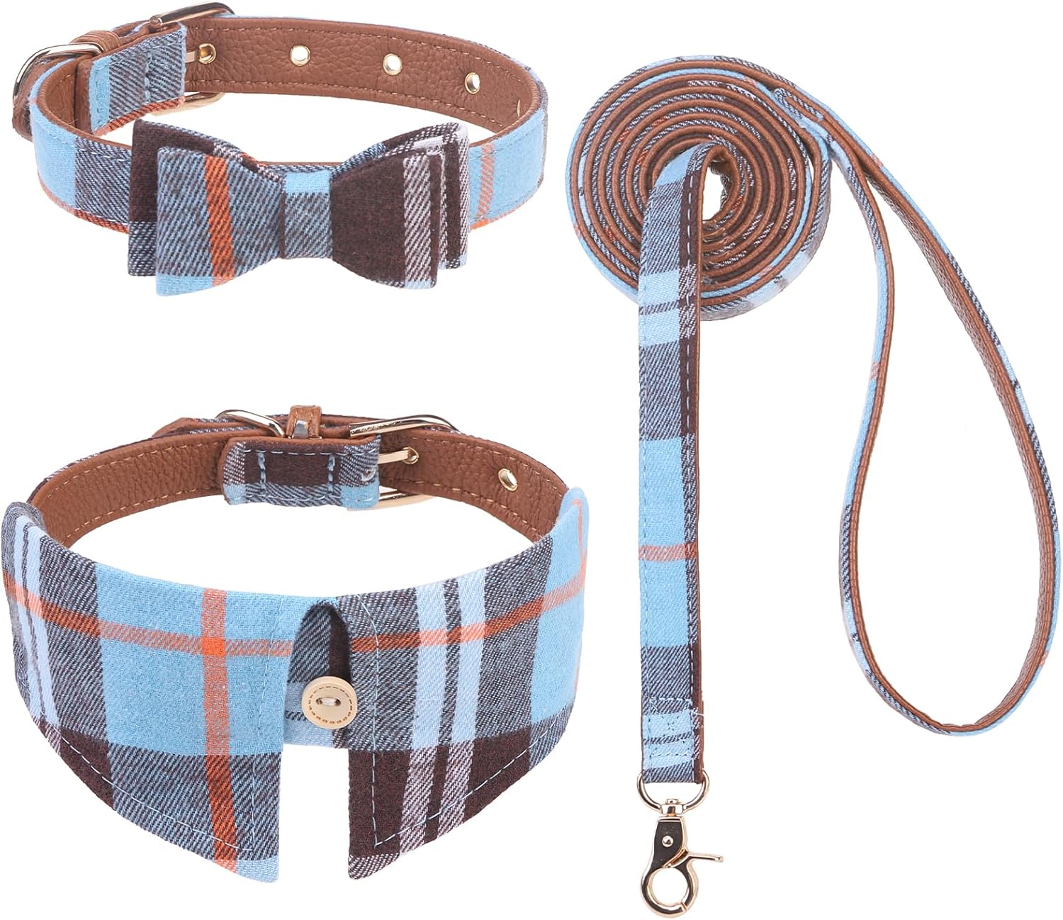 EXPAWLORER Puppy Collar and Leash Set - Classic Plaid Small Dog Collar with Bow Tie, 360 Swivel No Tangle Dog Leash, Adjustable Dog Collar for Small Medium Dogs Cats, Sky Blue S