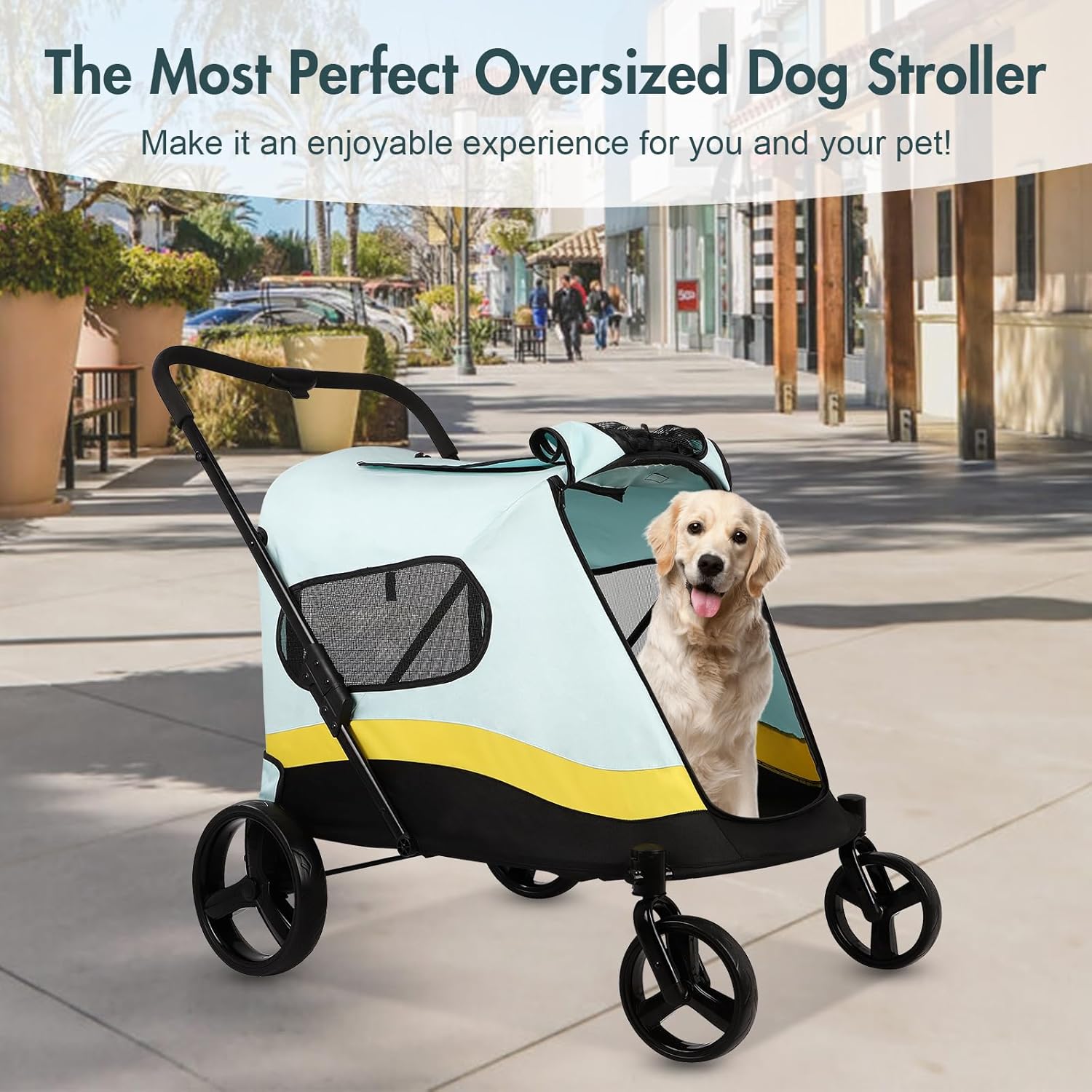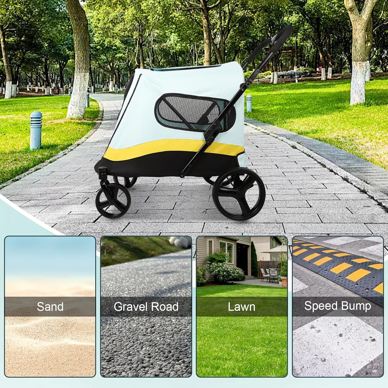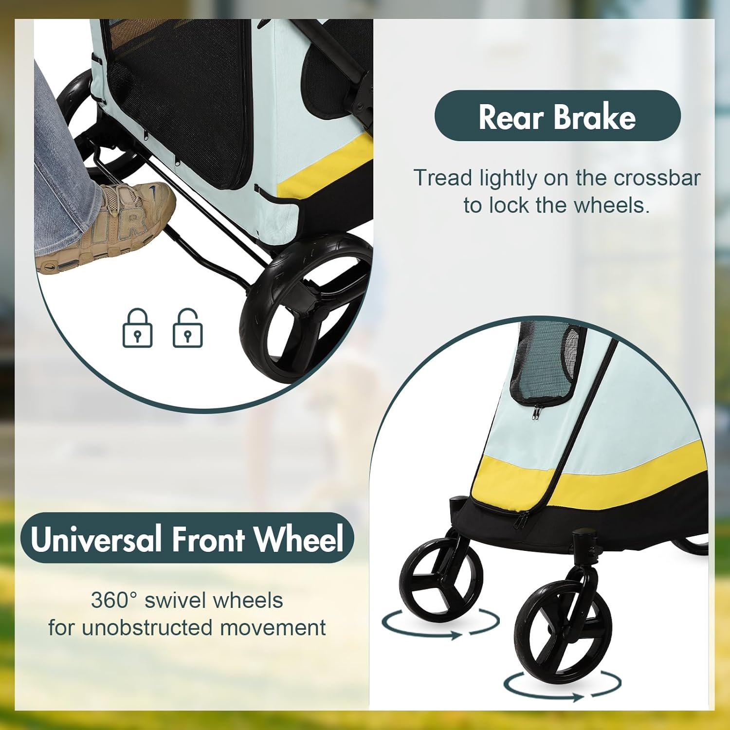 - 【Considerate Wheel Design】: This large dog stroller has universal front wheels that can swivel 360° and rear wheels equipped with a braking system that can be easily braked and will not slide on slopes