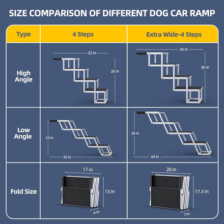 - Lightweight and Portable: This aluminum frame foldable dog stair with soft foam handle weighs only 13 lbs. Not only can these protect your car from scratches, but also make it easier and more comfortable to carry. The lightweight pet ramp can fold down into a convenient size of 20×17.3×7 inches and be placed in the trunk or cabinet of the car for easy storage without taking up a lot of space