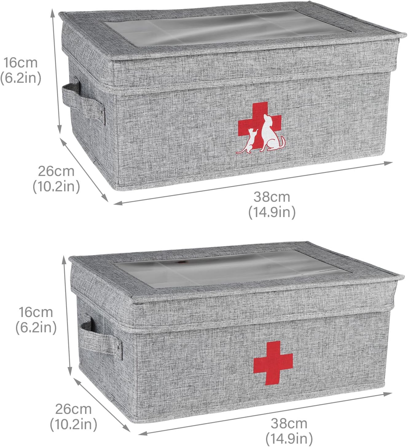- 5. First Aid Kit Case Set Dimension: These two medicine organizer holder for family and pets all sized at 38 x 26 x 16cm / 14.9" x 10.2" x 6.2" (LxWxH). The first aid bins can hold the medicine essentials which meet your daily needs and helps you take better care of you and your families. You can keep this handy organizer container in your bedroom, living room, dining room, kitchen, bathroom, home office and car.