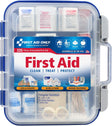This jobsite, home, and vehicle first aid kit contains enough essential first aid supplies to address injuries in up to 100 people. The perfect first aid kit for car, home, and office, this 335-piece kit includes office must haves for minor emergencies. Packaged in a durable plastic case, this emergency kit for car, home and job site features organizational compartments and a clear cover that allows you to quickly locate emergency supplies. This all-purpose portable emergency car kit and office kit features an ergonomic handle and can be stored in drawers, desks, or cabinets. Ideal for home, traveling, and taking on the go, our first aid kits for businesses, homes, and cars allow you to handle minor cuts and scrapes just about anywhere.