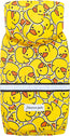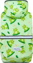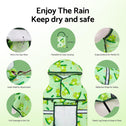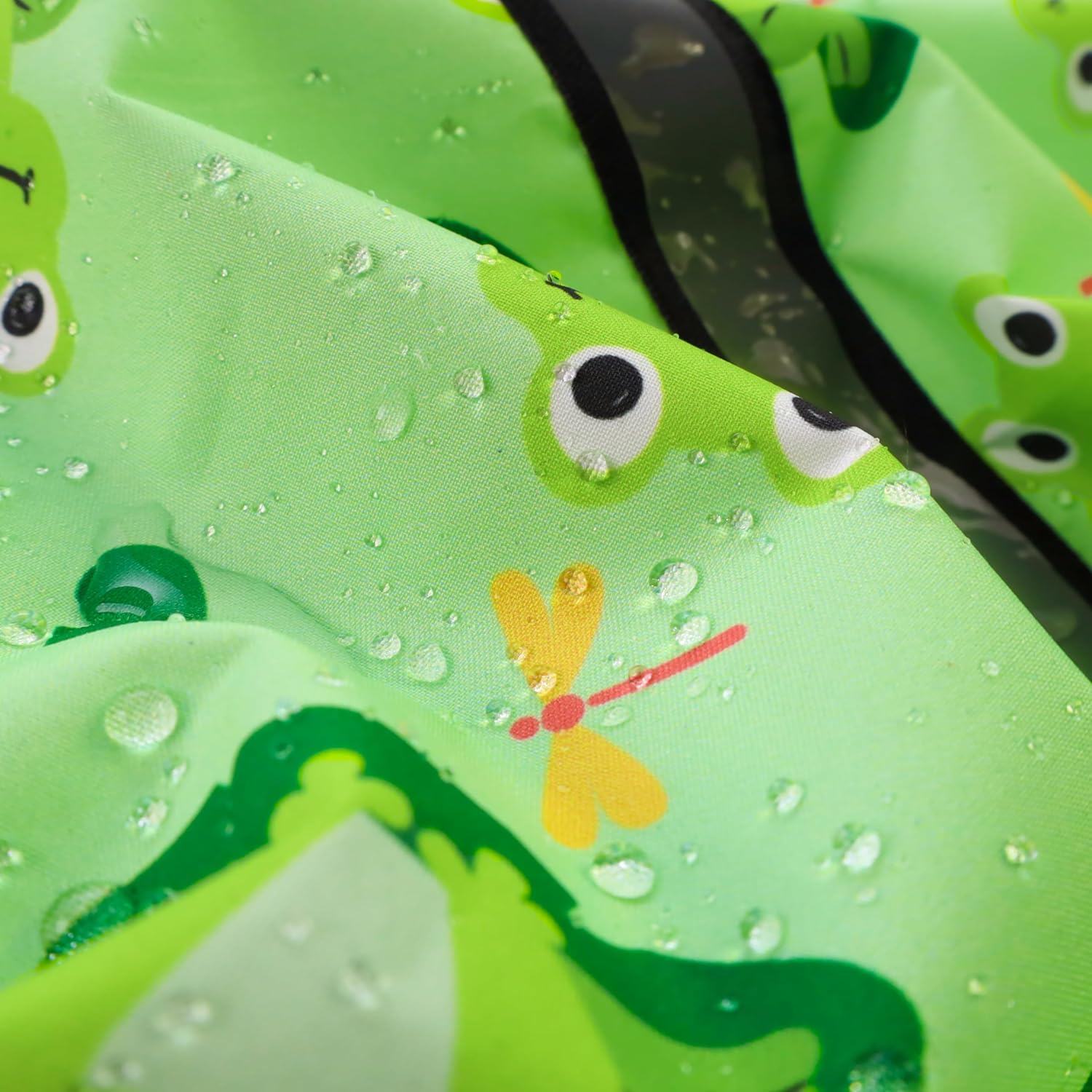 Green rain suit features frog on ruffle and dragonflies patterns for extra cuteness. Reflecting stripes and a harness opening with a flap for visibility, designed with a hood for full coverage and protection. Attached adjustable velcros and button up closures for a secure fit.