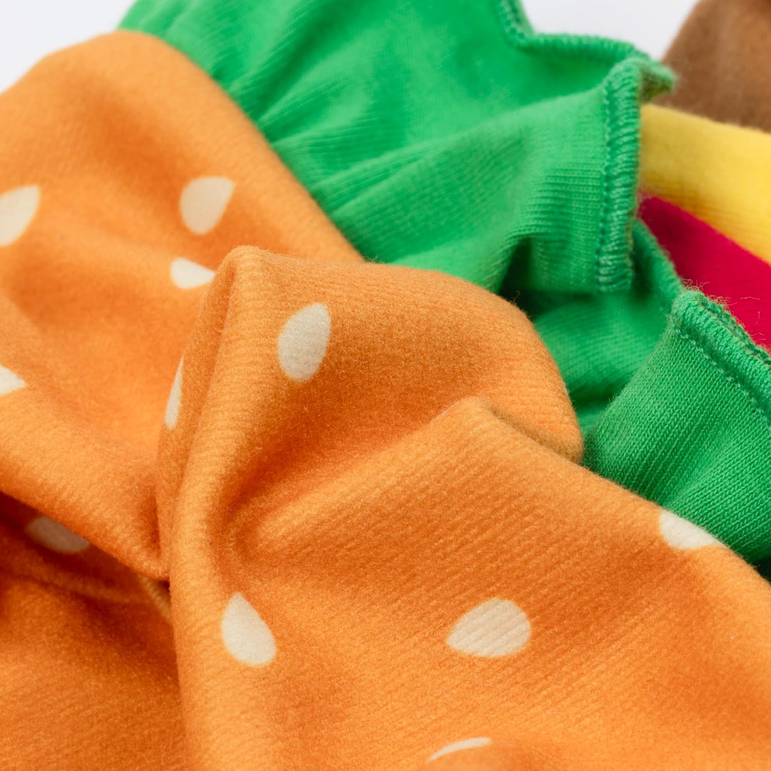 - Creative hamburger doggy Halloween costume features a stacked design with sesame seed “bun” top, ruffled green “lettuce,” and colorful felt layers representing cheese, tomato, and patty. Unique and imaginative look that brings a touch of cuteness to any costume party or holiday event.