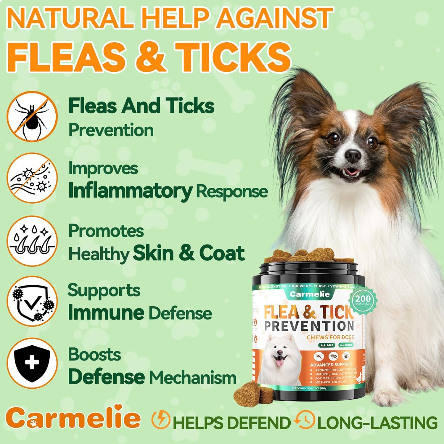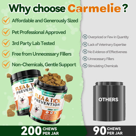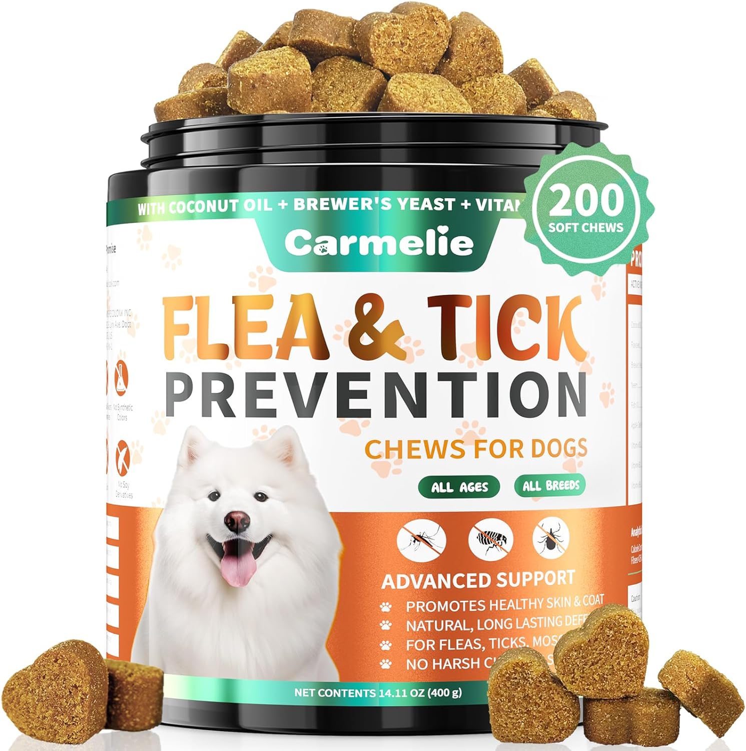 - Effective Health Support: Carmelie flea and tick chews are made with only natural ingredients to ensure the safety of your beloved pet. Each soft chew is rich in coconut oil, garlic powder, flaxseed, and brewer’s yeast, and free from harsh chemicals or artificial additives. Whether for puppies or senior dogs, they can safely enjoy these chews while benefiting from multiple health supports, from flea control to skin care.