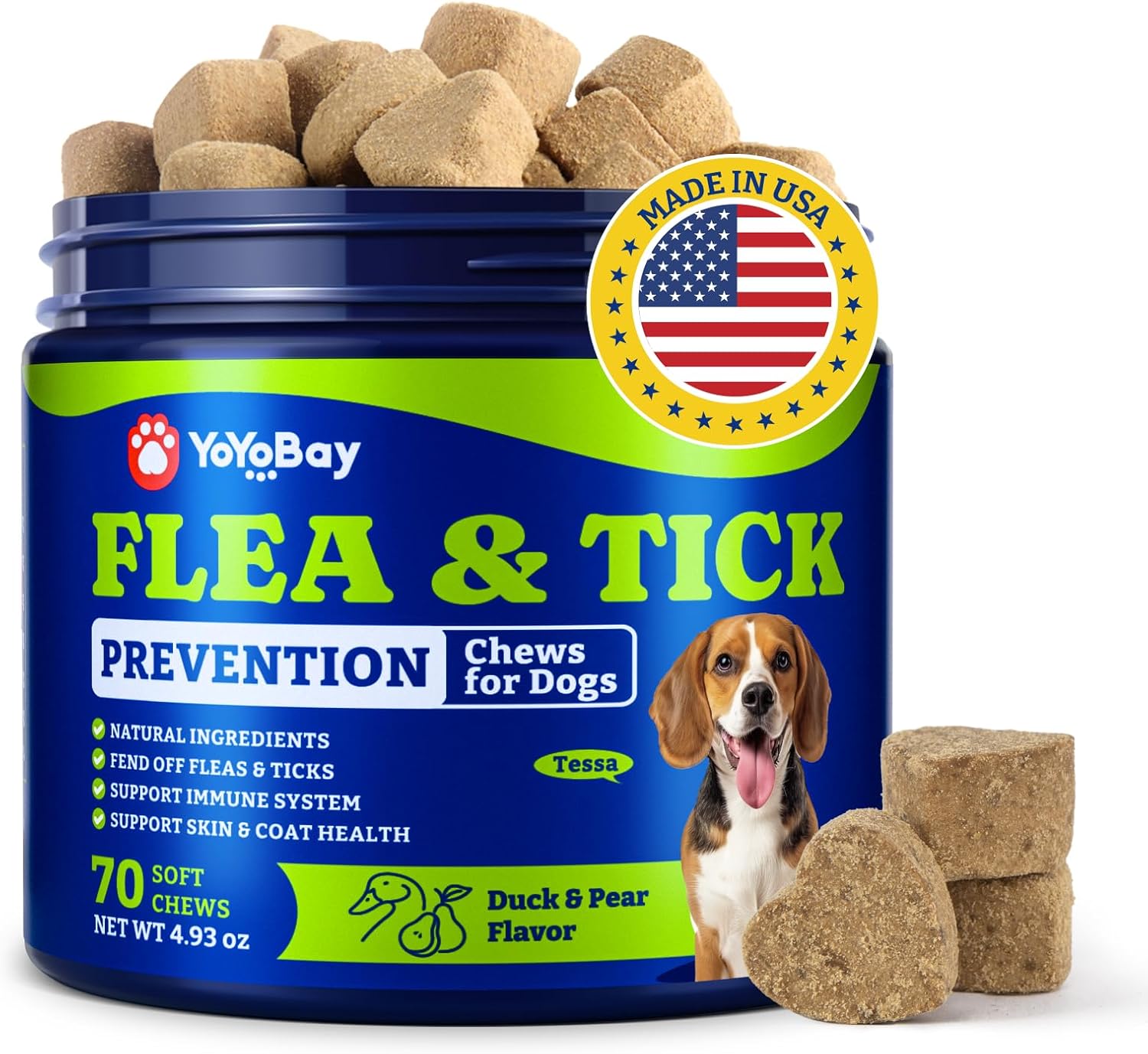 - Delicious Duck & Pear Flavor: Our dog flee and tick prevention chews combine the tasty flavors of duck and pear, designed to delight your dog while supporting digestion, coat health, and overall well-being. Treat your dog to a delicious and beneficial supplement they’ll enjoy every day.