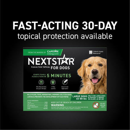 When it comes to fleas and ticks, time is of the essence. That’s why you can trust NextStar for fast-acting, long-lasting protection. NextStar Flea & Tick Prevention is a fast-acting 30-day flea & tick topical protection. Our veterinarian-recommended** topical formula provides your dog with 7-way pest protection against fleas, ticks, mosquitoes, chewing lice, flea eggs, larvae, & prevents the development of flea pupae – with no prescription needed. NextStar is an easy-to-use, waterproof topical formula that breaks the flea lifecycle and starts working in 5 minutes for 30 days of protection. Apply NextStar once every 30 days for year-round protection from fleas and ticks. Rest easy knowing your dog is protected with fast-acting flea & tick topical from NextStar.