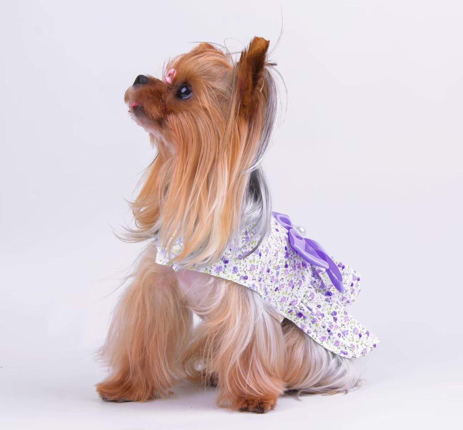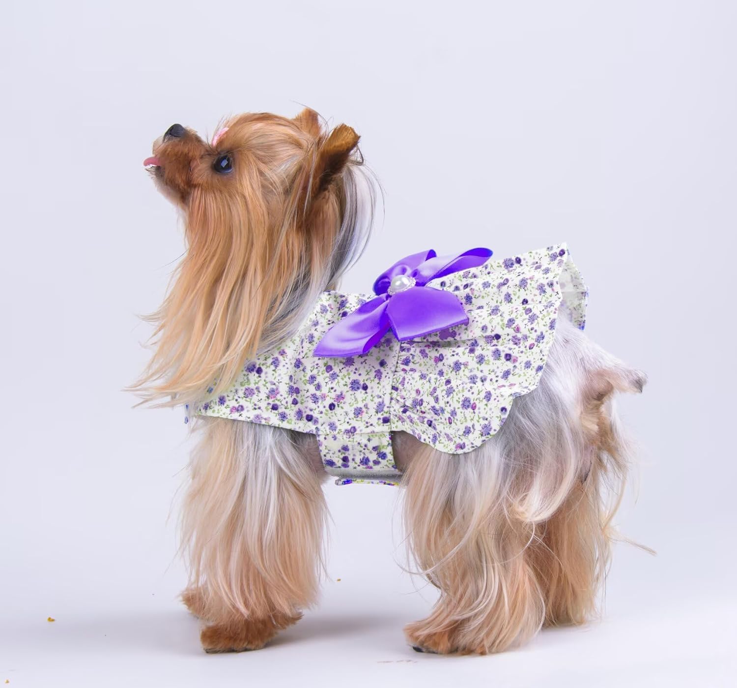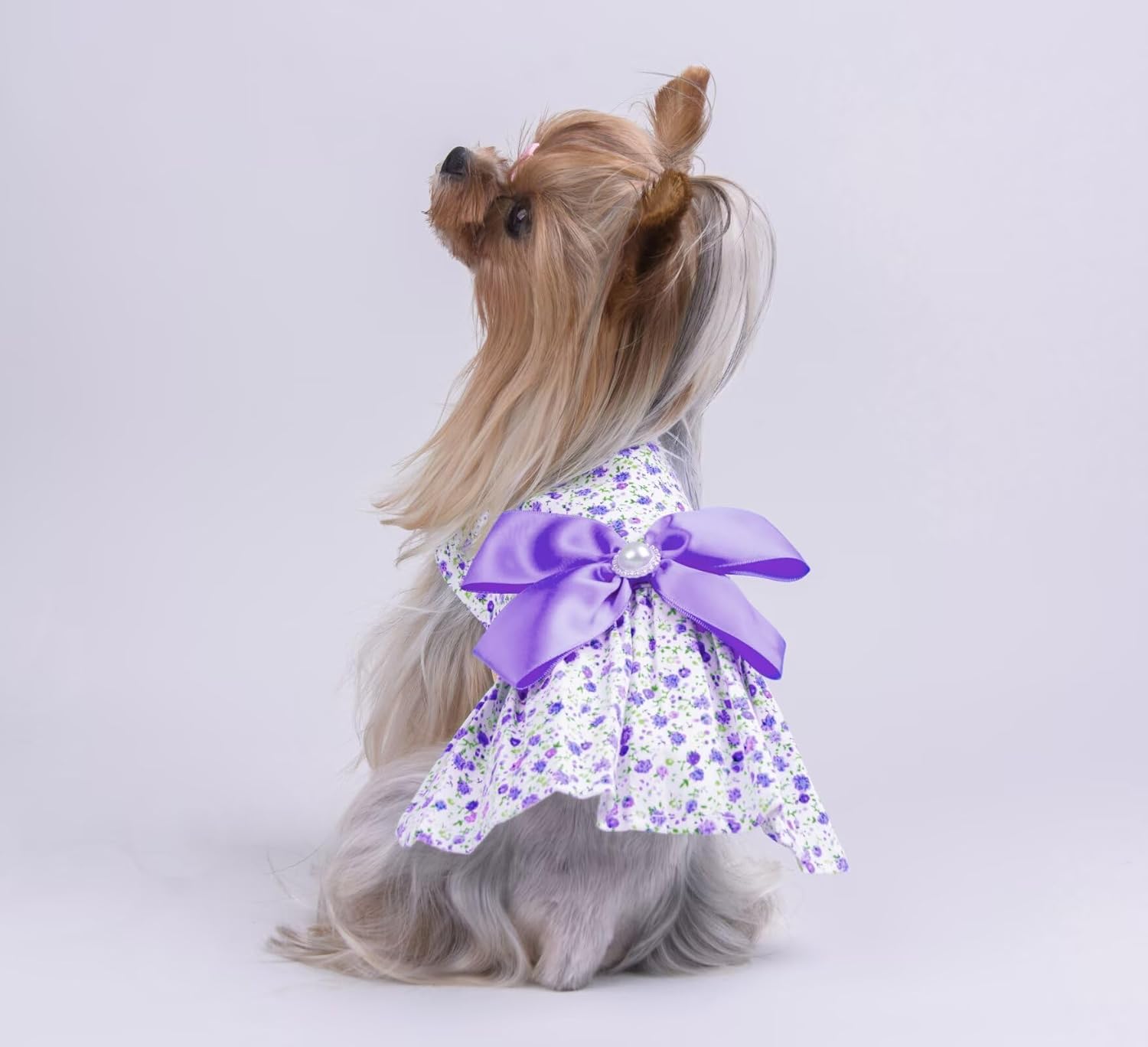 • Adorable Floral Design: The dress features a charming pattern of small purple flowers, accented with a vibrant purple bow, making it a perfect blend of cuteness and style for your furry friend