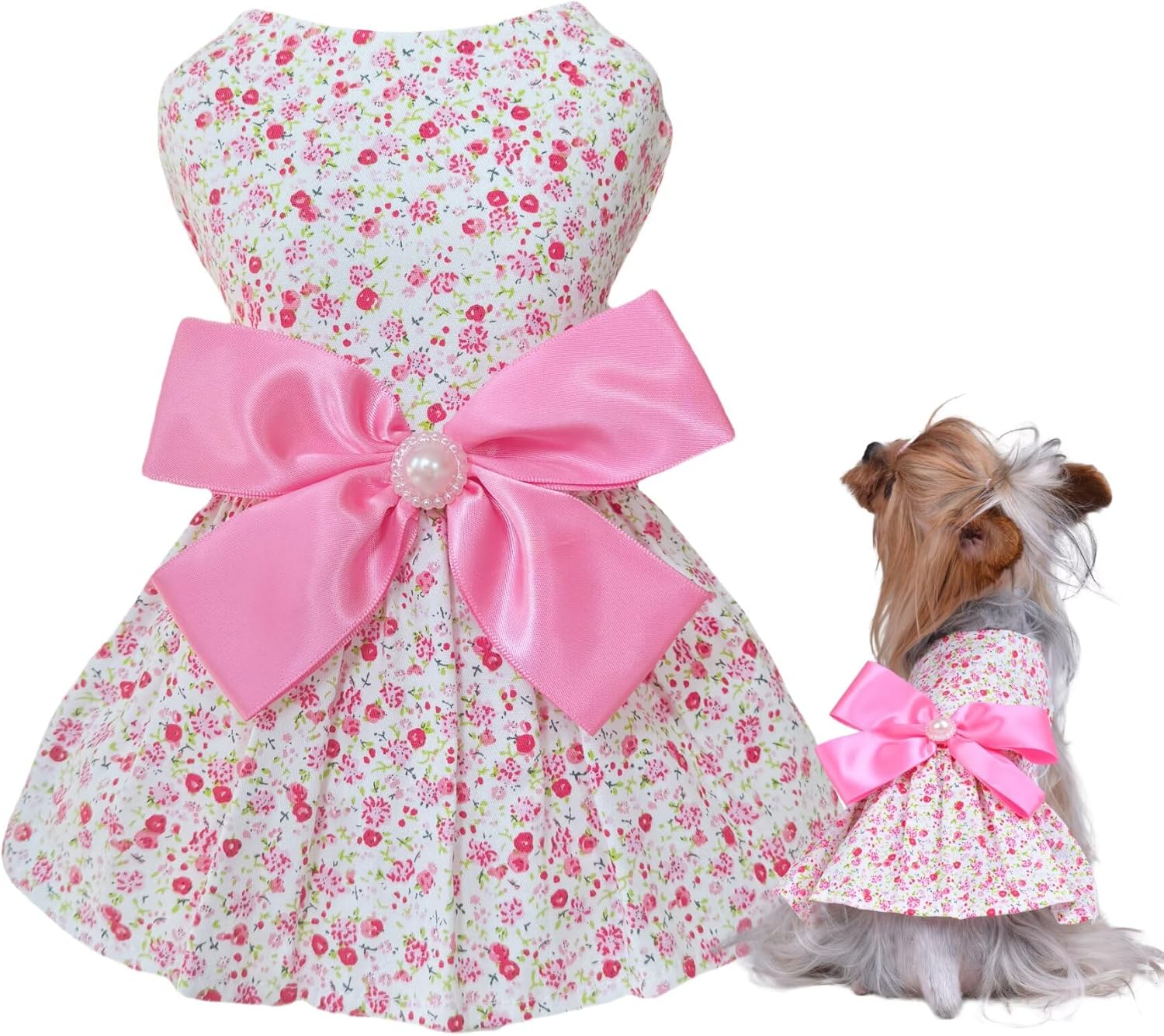 Floral Print Dog Dress with Satin Bow and Pearl for Small Dogs Girl,Cat Apparel,Purple, XX-Small
