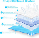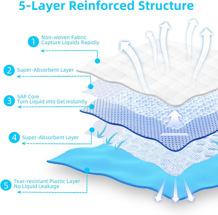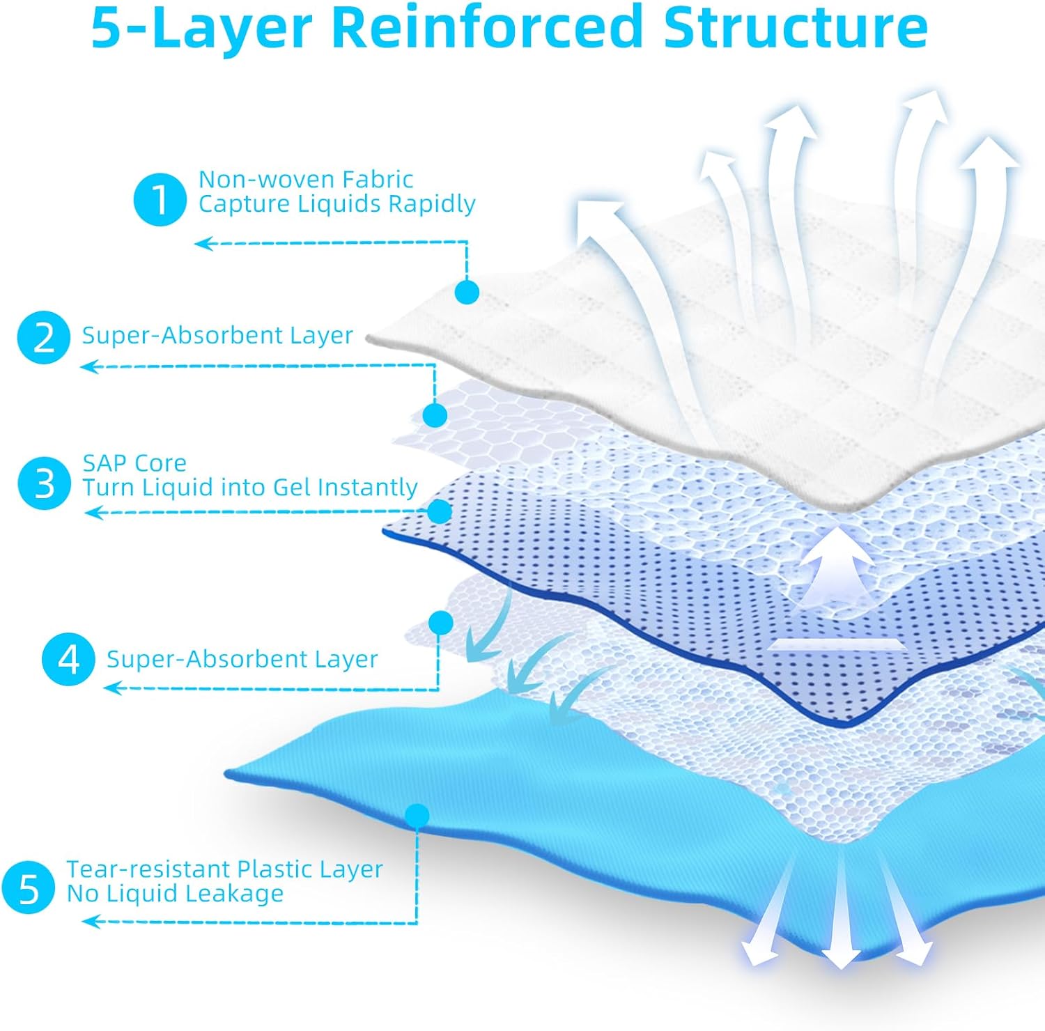 - [5-LAYER CONSTRUCTION] Our training pads are made with 5 layers: non-woven cloth as the first layer to allow urine to flow through; the second and the fourth layers are made from paper tissue to add absorbency; the third layer is also the core layer is made from Super Absorbent polymer, and the back layer is a water-proof plastic protecting layer.