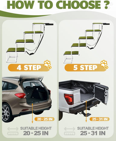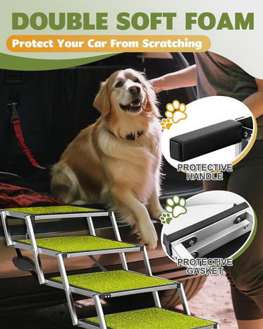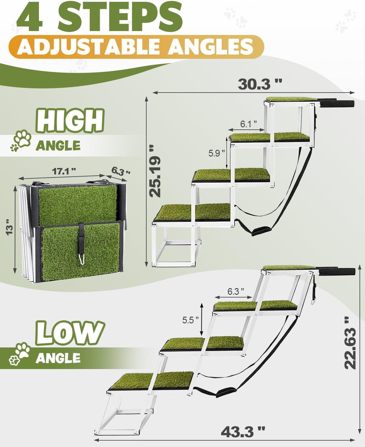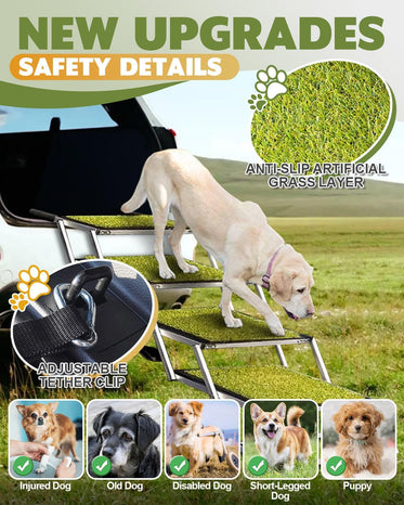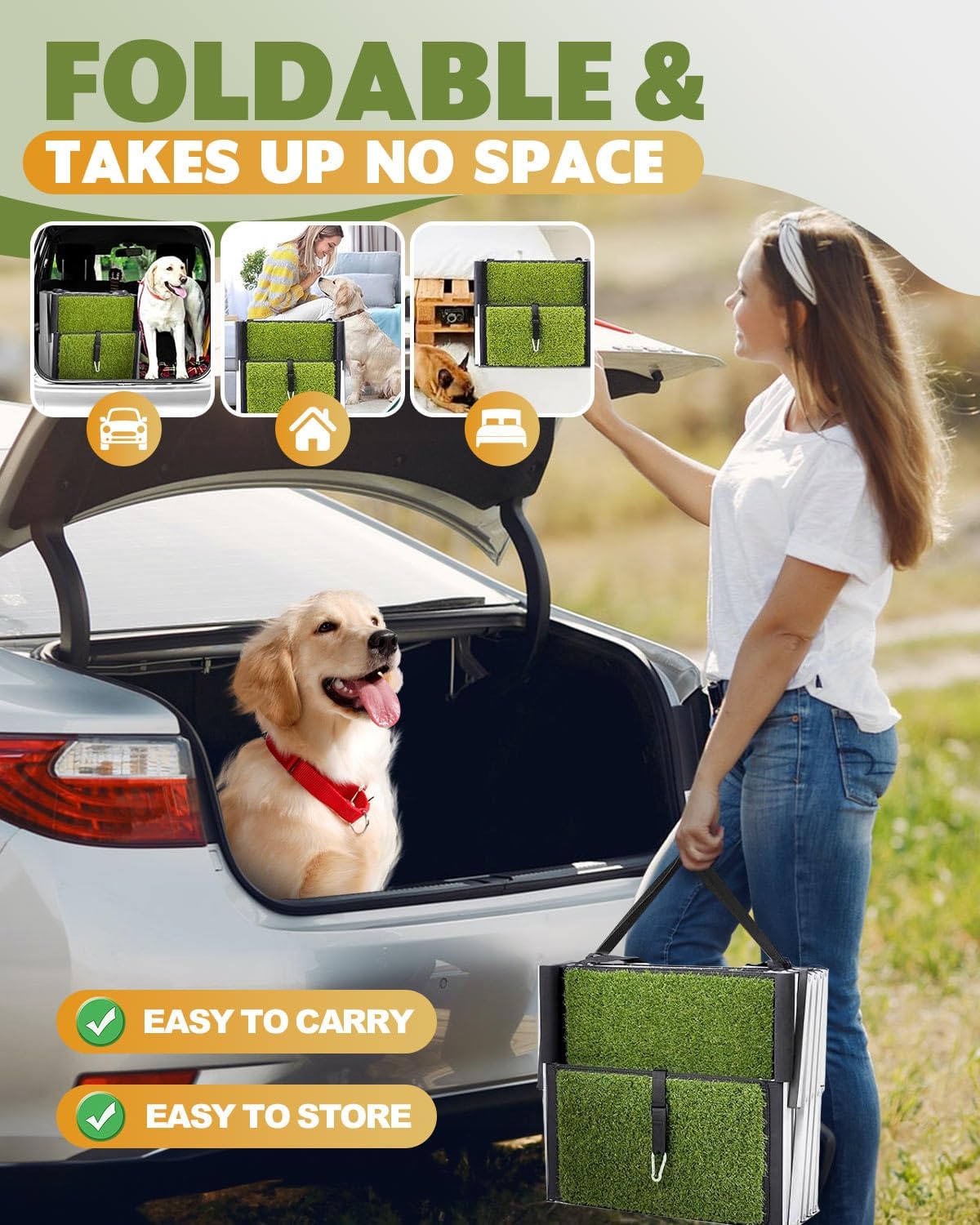 - Safe & New Design: Our dog stairs feature a non-slip surface with a soft artificial grass padding, creating a secure and comfortable experience for your pet. The textured coating prevents slipping, while the grass collects dirt from their paws—keeping your car and home clean!