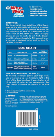 Keep your dog dry and your home clean with Wee-Wee Disposable Dog Diapers. These highly absorbent diapers are specially designed with a Foam-Fit Tail Hole and leak-guard flaps to provide a snug, comfortable fit and leak protection for 12 hours. This unique feature ensures the diaper stays put and dog waste stays where it belongs—even on the most enthusiastic tail-waggers! For added ease, the diaper's flex-fit design is double-stitched and conforms to your furry friend's body for extra comfort, protection, and peace of mind. Plus, each diaper has repositionable fasteners that won't tear. Always know when it is time for a fresh diaper with the helpful Fashion Paws Wetness Indicator. When the blue pawprint design fades, it is time for a change! Perfect for both male and female dogs, these disposable diapers for dogs are great for potty training, females in season, dogs with incontinence, senior dogs, excitable urination, and more.