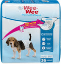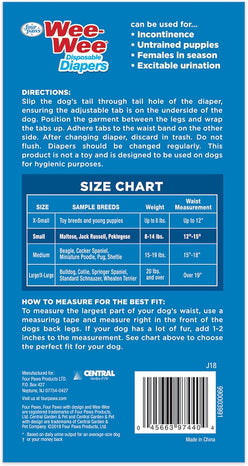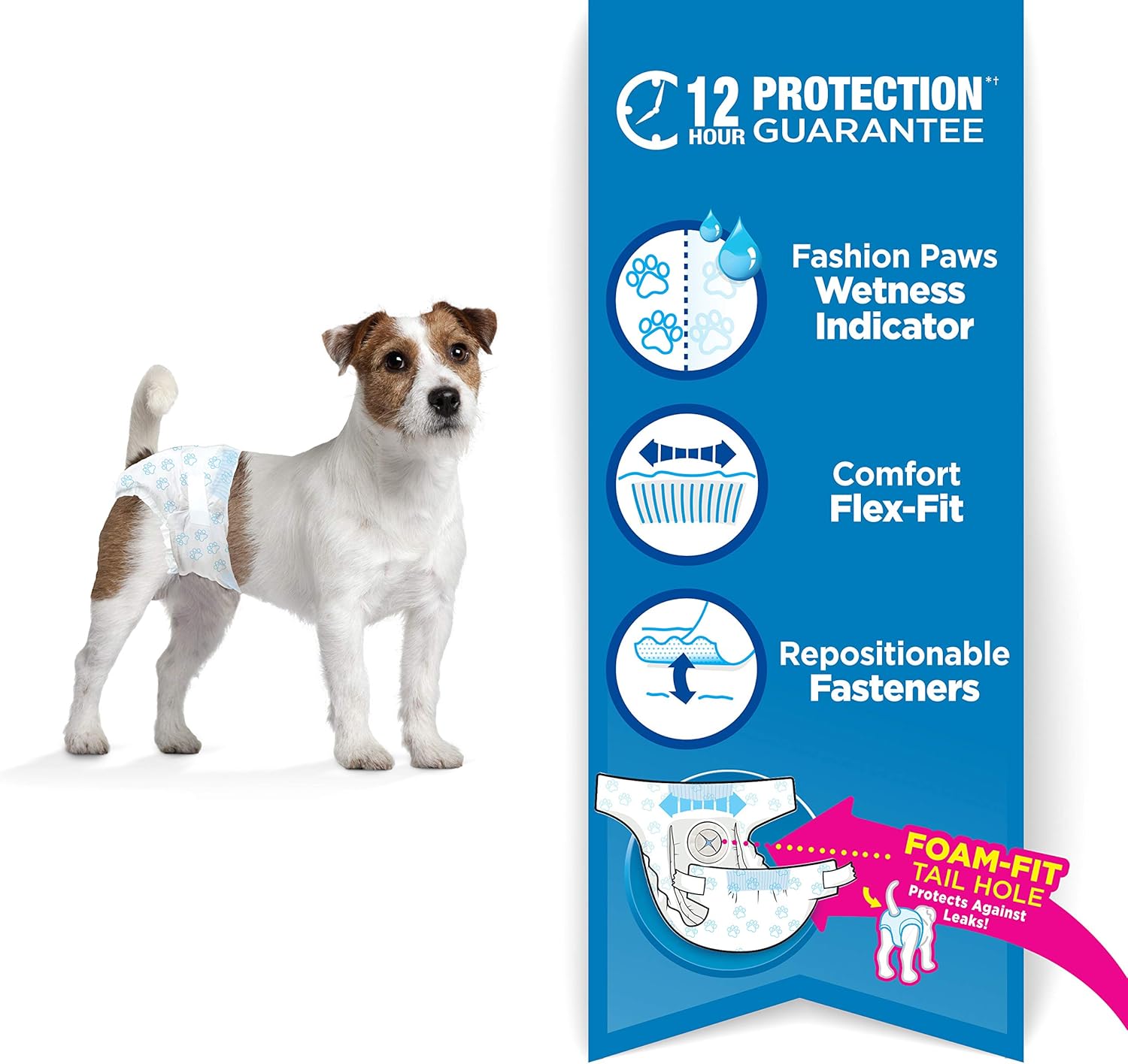 Keep your dog dry and your home clean with Wee-Wee Disposable Dog Diapers. These highly absorbent diapers are specially designed with a Foam-Fit Tail Hole and leak-guard flaps to provide a snug, comfortable fit and leak protection for 12 hours. This unique feature ensures the diaper stays put and dog waste stays where it belongs—even on the most enthusiastic tail-waggers! For added ease, the diaper's flex-fit design is double-stitched and conforms to your furry friend's body for extra comfort, protection, and peace of mind. Plus, each diaper has repositionable fasteners that won't tear. Always know when it is time for a fresh diaper with the helpful Fashion Paws Wetness Indicator. When the blue pawprint design fades, it is time for a change! Perfect for both male and female dogs, these disposable diapers for dogs are great for potty training, females in season, dogs with incontinence, senior dogs, excitable urination, and more.