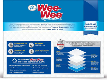 A SUPERIOR PAD FOR A SUPERIOR PUP Wee-Wee Superior Performance Gigantic Dog Pee Pads are 80% larger and more absorbent than the original 6 layer Wee Wee Pads! Now designed with Runoff Edge Guard, these XXL dog pee pads trap excess liquid on all 4 sides to keep your floor dry! Combined with a 6 layer Leak Proof Floor Armor System, each pad offers complete 24 hour protection. Plus, all Wee-Wee Pads include targeted attractant to draw your dog to the pad and prevent potty training accidents elsewhere. Each pad measures 28 inches x 34 inches and is perfect for large dogs! AMERICA'S ORIGINAL TRUSTED PADS We've been in the business of managing your pet's business ever since developing the original Wee-Wee Pad in 1970! From house breaking to simply providing dogs a comfy indoor "go" spot, our variety of pads and training supplies have been trusted by pet parents for decades. GET TO KNOW FOUR PAWS We get it: raising a furry friend comes with many special responsibilities! Ever since introducing Wee-Wee Pads 50+ years ago, we've spent decades creating cat and dog products that take the guesswork out of caring for our best friends. Today, our simple yet innovative solutions help pet parents master potty time, conquer shedding season, and even keep their pet's gut health in check. GUARANTEED YOU'LL LOVE IT If you (or your furry friend) are not happy with your Wee-Wee Pads for any reason, return it to us with the sales receipt for your money back. Or, reach out to our Consumer Care team so we can help make it right.
