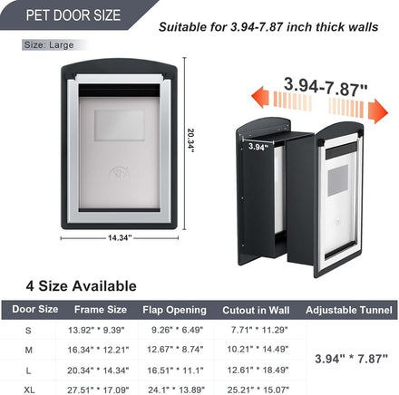 - Universal Wall Compatibility: Freestanding dog doors with retractable tunnels fit walls from 3.94" to 7.87" inches thick. It can be used with stucco, wood, brick walls and other materials. Frame size: 14.34"W * 20.34"H. Flap opening: 11.1"W * 16.51"H. Suitable for pets up to 100 pounds.