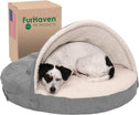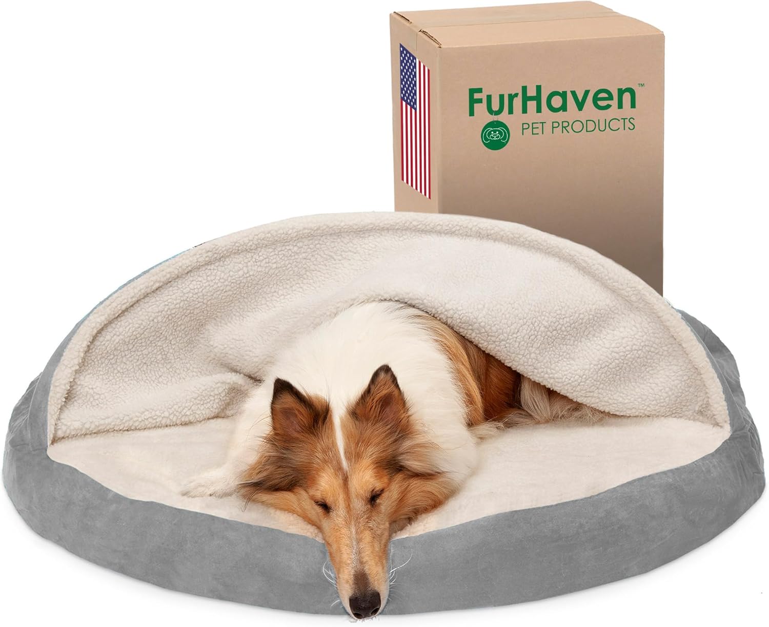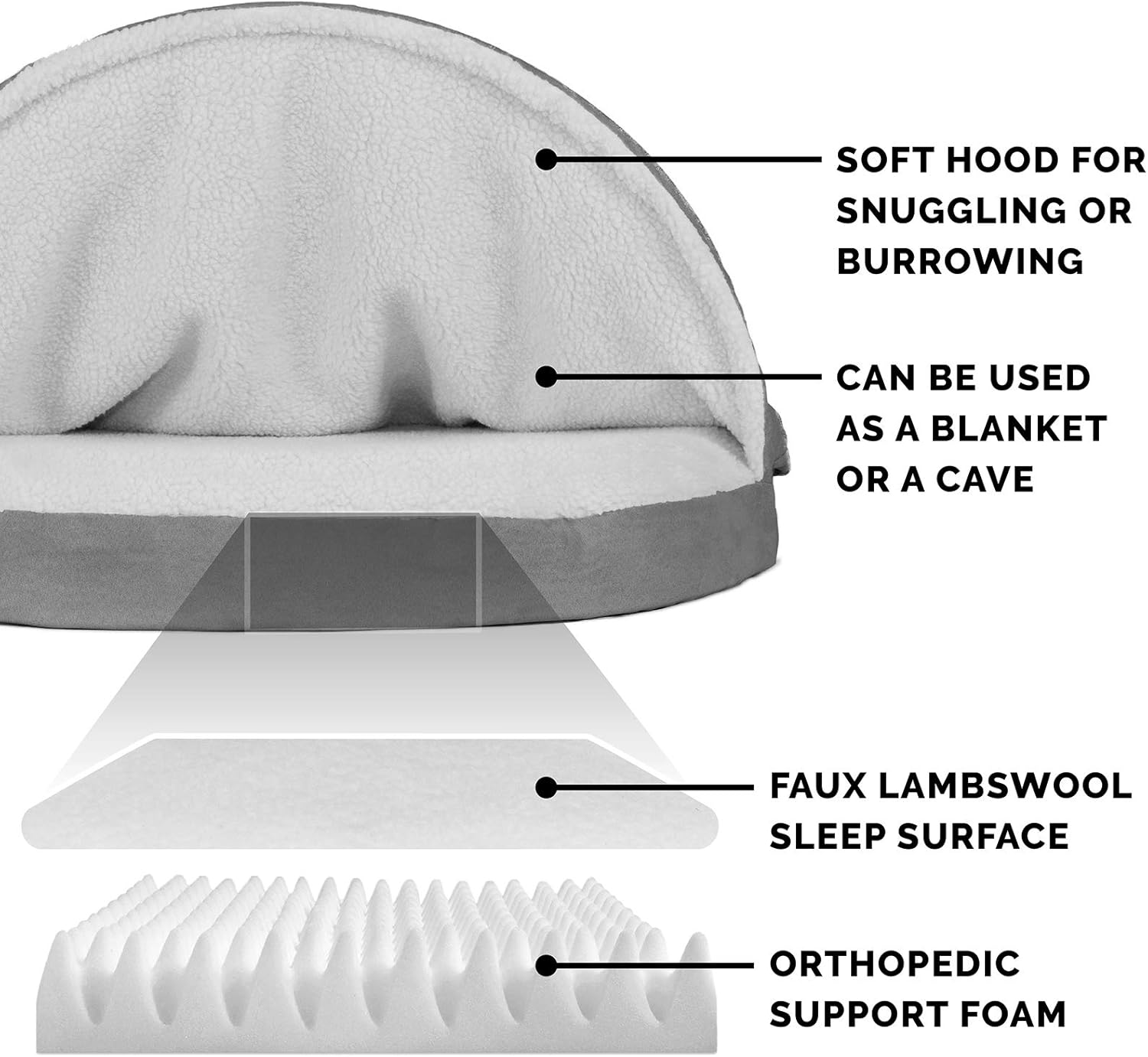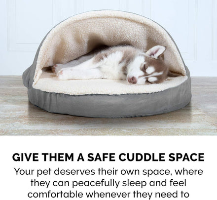 Furhaven Sherpa & Suede Snuggery Dog Beds are perfect for pets who love to burrow into blankets and other cozy spots! Snuggeries are constructed to let your dog or cat burrow and snuggle into the bed, with the top part of the bed functioning as a soft, shapeable, blanket. The soft hood feature can be used with or without the flexible plastic hoop to best suit your pet’s sleep style and burrow habits. The plastic hoop helps your pet get under the soft hood but does not stay up so that your pet will stay covered and cozy! The bed is fully lined in cream-colored sherpa fabric and provides a pleasant retreat for your pet’s privacy, warmth, and comfort! The mattress is made from egg-crate orthopedic foam, which promote your dog or cat’s ideal posture and joint health. Your pet will love their new cozy pet bed while you'll love having more room in your bed and less pet dander and fur! Easy to clean. Cover care: Remove from core before washing (see hang tag and/or seam label for care instructions). Foam care: Spot clean with mild soap; rinse. Blot, then air dry. Do not wring. Not for unsupervised use by animals with chewing behavior.