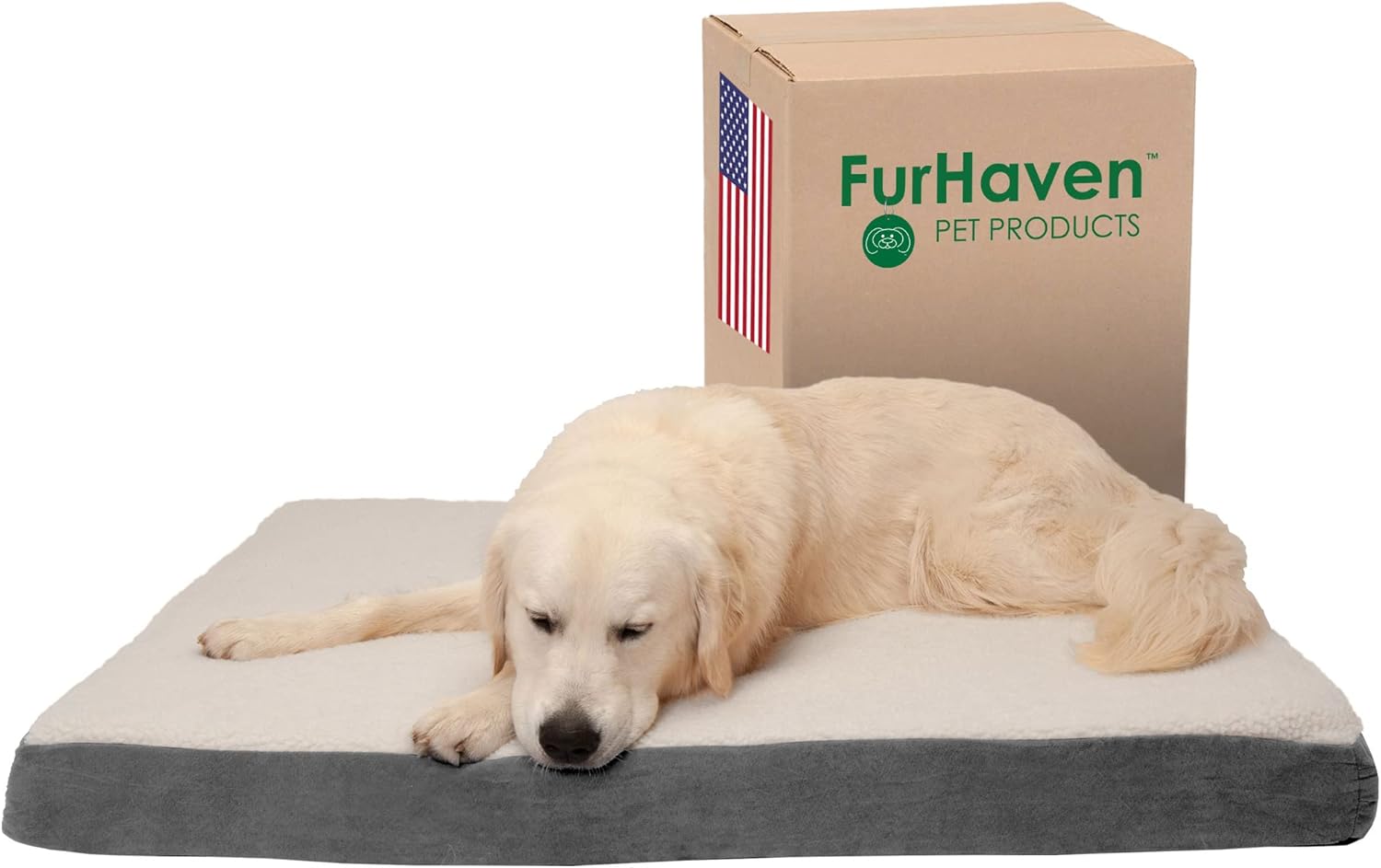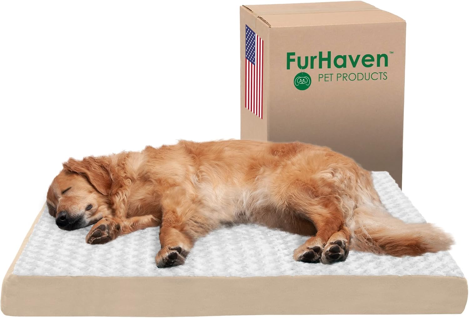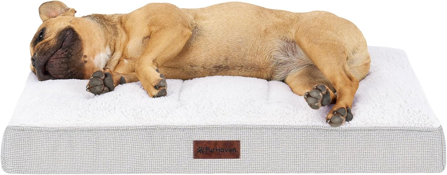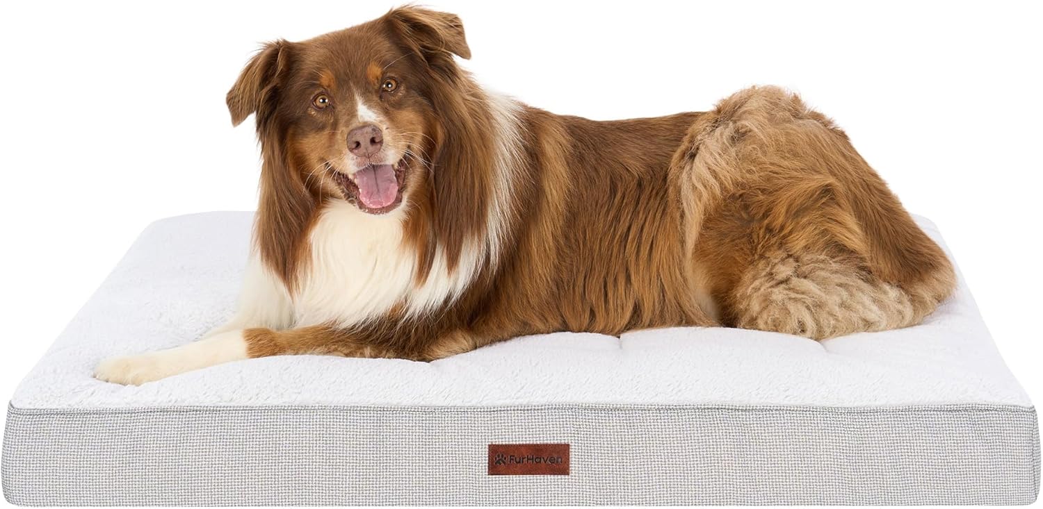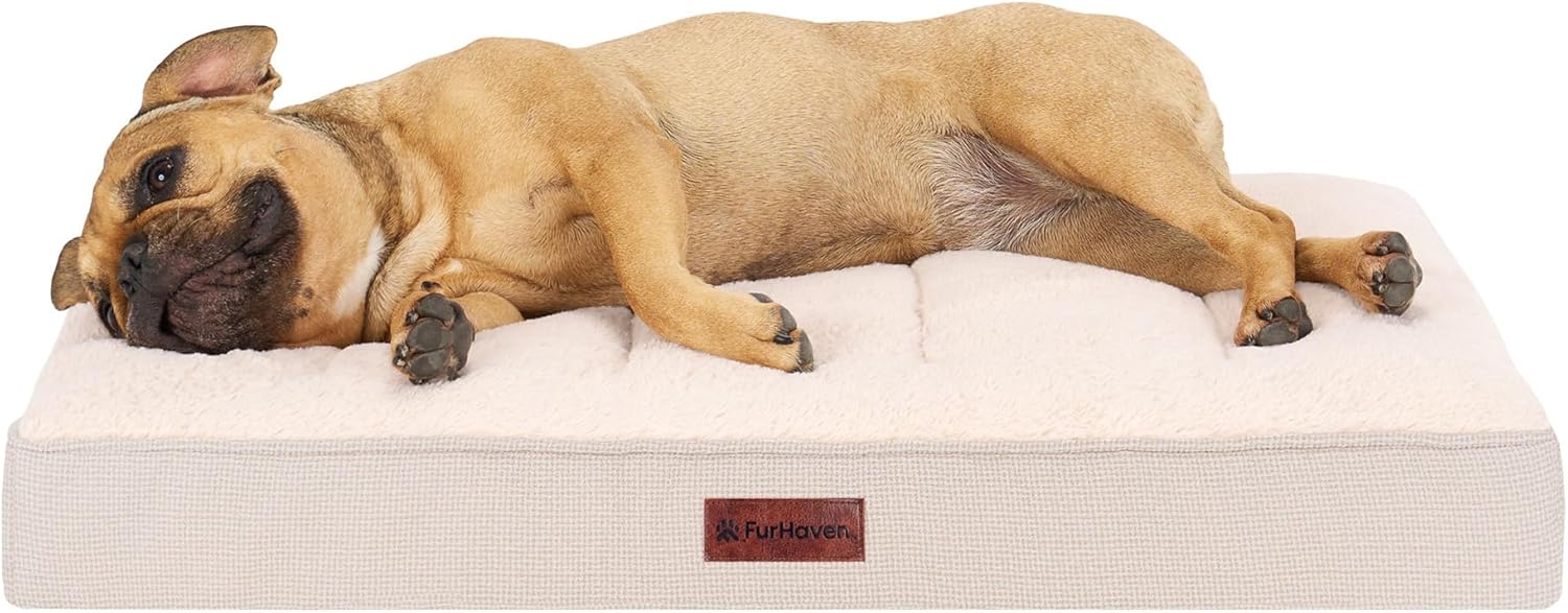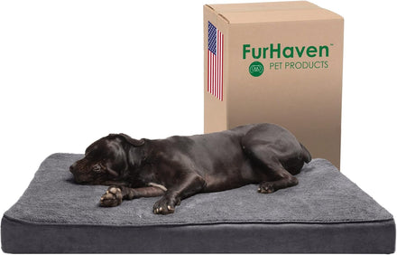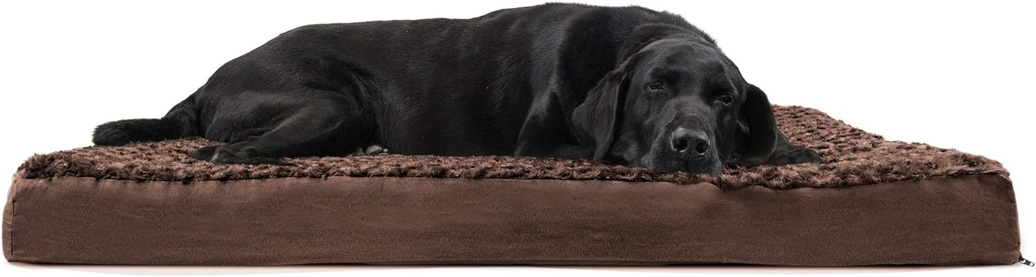 Give your best friend the support they need with a luxuriously soft Furhaven Ultra Plush Curly Faux Fur & Suede Mattress Dog Bed. Perfect for dogs and cats that love to sprawl in their sleep. The orthopedic (egg crate) foam base supports your pet's joints, cushions pressure points, and helps improve air circulation for optimum rest. The Jumbo Plus option, for larger breeds, features a solid slab orthopedic foam for greater support and comfort. The zippered cover is easily removed and machine washable for your convenience. Low profile, step-on design for easy access by older or disabled pets. Easy to clean. Cover care: Remove from core before washing (see seam label for fabric care instructions). Foam care: Spot clean with mild soap; rinse. Blot, then air dry. Do not wring. Not for unsupervised use by animals with chewing behaviors.y.
