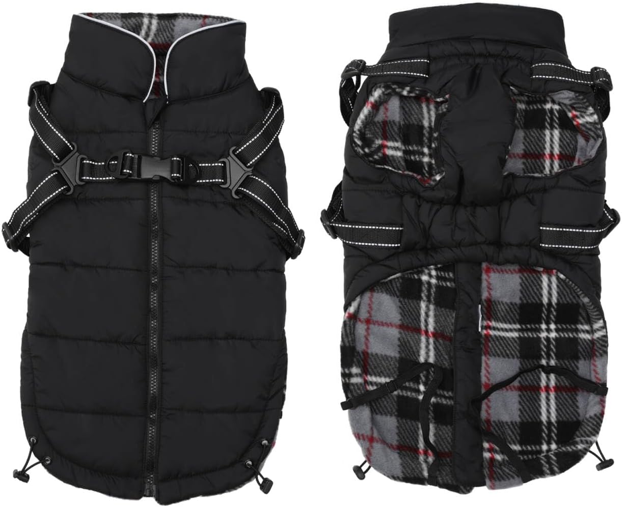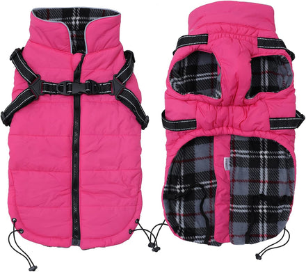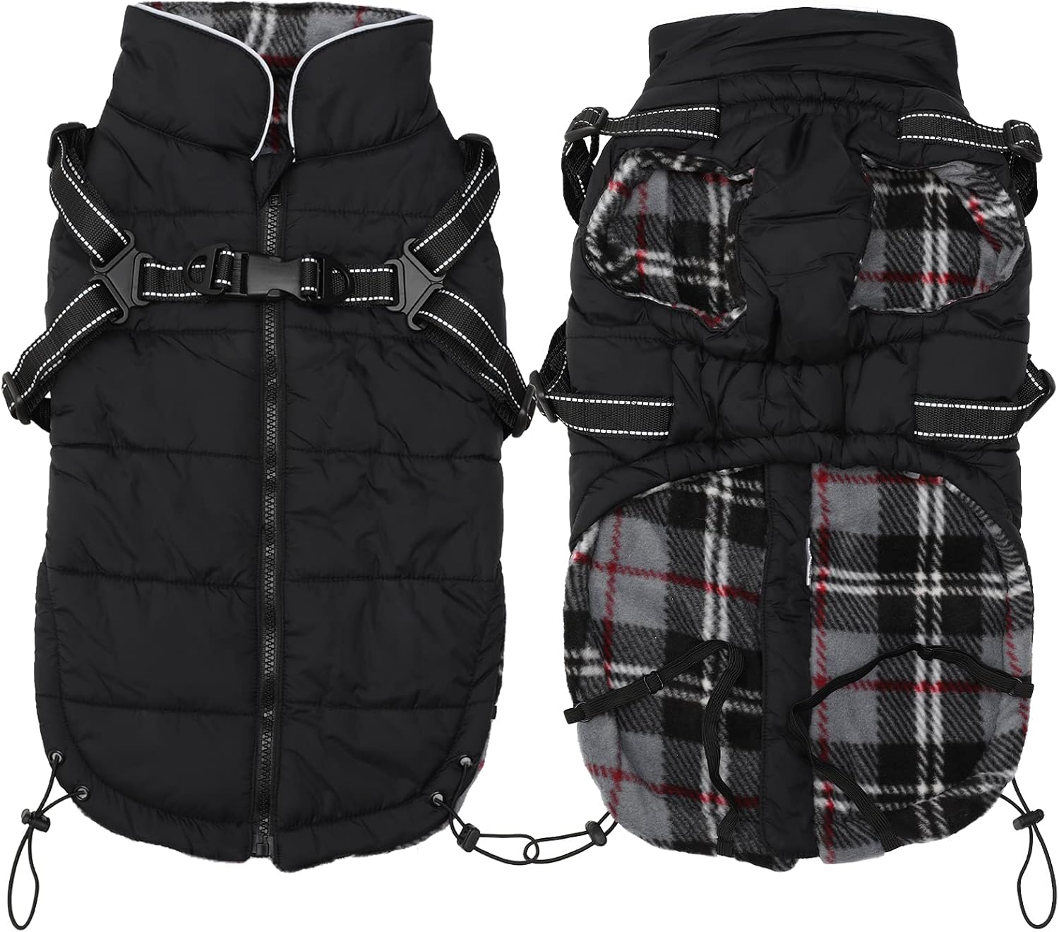 • 1. Dog autumn and winter clothes warm polyester coat weatherproof,Pet outdoor jacket,with harness traction belt,traction belt conjoined design,easy to control your dog