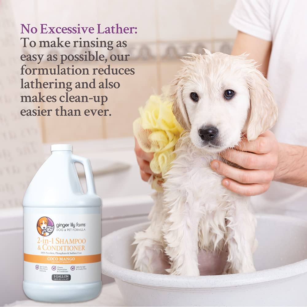 Ginger Lily Farms Dog & Pet Formula 2-in-1 Shampoo & Conditioner features our best-selling coco mango fragrance so your favorite pets smell luscious and fresh. Our formula does not contain harmful ingredients such as parabens, phosphates, and sulfates so you can feel good while using it on your pets. Easy rinse formula washes away clean without leaving residue. Ginger Lily Farms is PETA Certified.