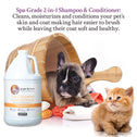 - Spa-Grade 2-in-1 Shampoo and Conditioner: Cleans, moisturizes and conditions your pet’s skin and coat making hair easier to brush while leaving their coat soft and healthy.