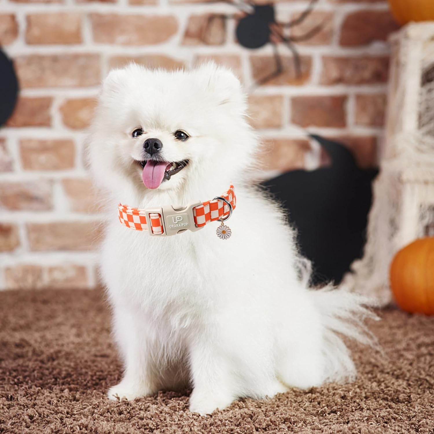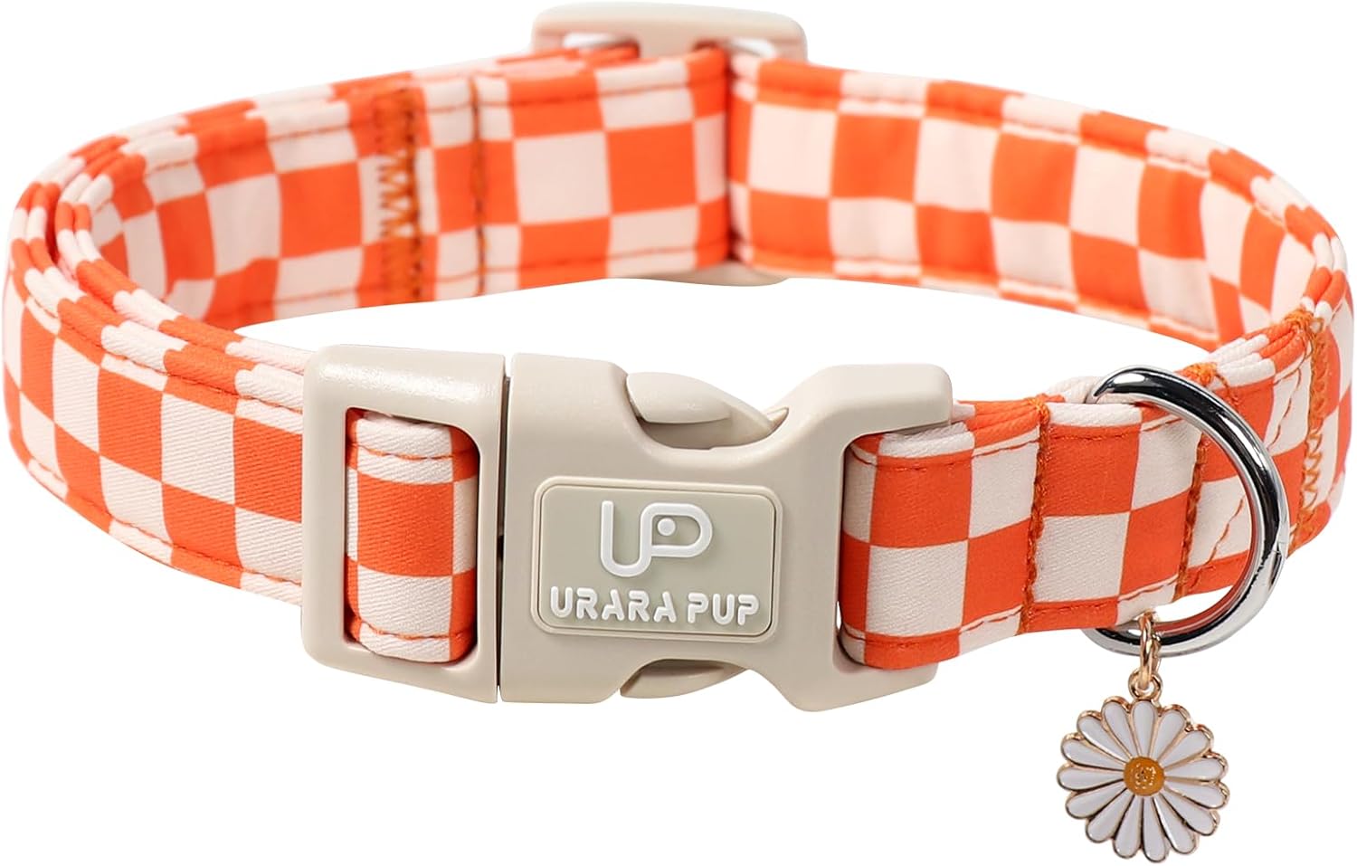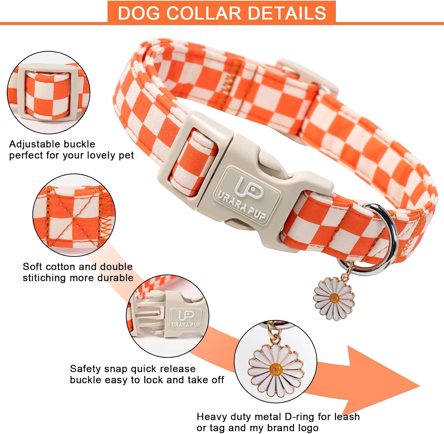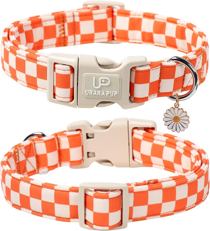 Product Description: Fall Gingham Dog Collar: This orange and white checkered dog collar brings fresh picnic vibes to your pup’s fall wardrobe. With a soft gingham pattern and adorable daisy charm, it’s perfect for dogs who love to look sweet and seasonal during autumn walks or holiday gatherings. The UP URARA PUP store presents this stylish fall dog collar inspired by countryside fall fashion. Also known as a gingham puppy collar or fall picnic collar, it combines classic design with comfort and charm—making it a beautiful seasonal accessory for pets. Five Different Sizes: Available in XS, S, M, L, and XL. Whether you have a tiny puppy or a large breed, this adjustable collar offers a secure and snug fit. Please check our sizing chart before purchase to get the best fit. If you need help, we’re just a message away. Soft Cotton Fabric + Daisy Charm: Crafted from breathable cotton, this collar is gentle on your pet’s neck and suitable for everyday use. The cute gold daisy charm adds a delicate and playful touch—making it great for festive photos or pet gifts. Applicable Occasions: A perfect accessory for fall walks, family outings, pet photoshoots, and Thanksgiving gatherings. This classic orange gingham collar helps your dog stand out with charm and comfort—whether you’re out for a stroll or celebrating indoors.