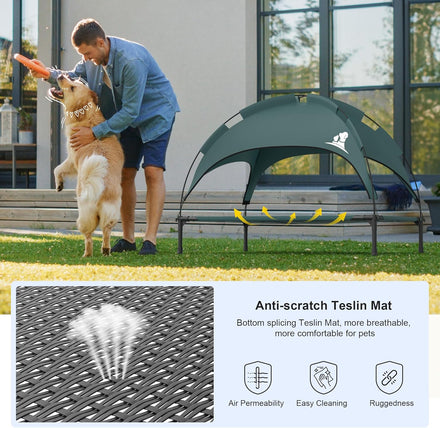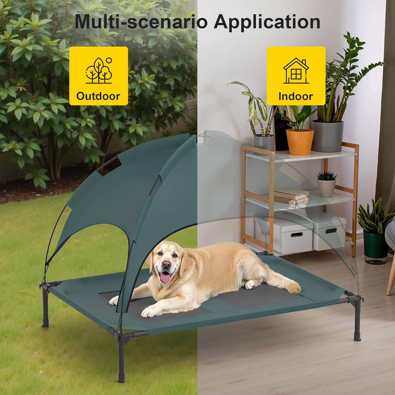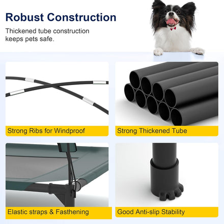 - 【Elevated Dog Bed w/ Canopy】This dog bed is crafted with high-quality Oxford and Textilene that are both durable and weather-resistant. The spliced bed surface design makes the dog bed cooler and more breathable, which is beneficial to the dog's health and brings a more comfortable life.