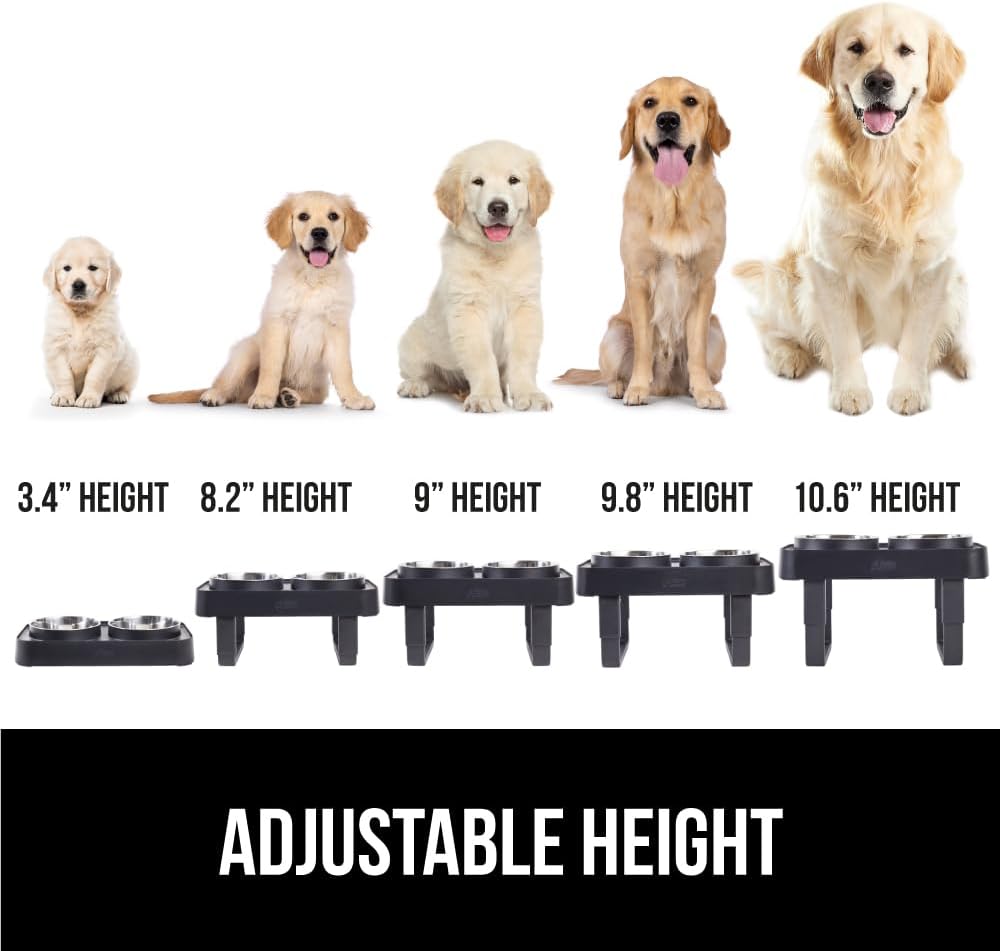 - MANY HEIGHTS TO GROW WITH YOUR PET: stand adjust to 5 different heights to grow with your pet; no more upgrading bowls at different stage of your pet’s life; Flat is 3.36 inches; 1st Raised Notch: 8.19 inches; 2nd Raised Notch: 8.98 inches; 3rd Raised Notch: 9.76 inches; 4th Raised Notch: 10.55 inches