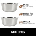 - RAISED EDGE AND EASY TO LIFT, 6 CUP BOWLS: smooth raised edges around the stand catch spills and stray food; easy lift finger notch for simple bowl removal from stand; feeder includes 2 large 6 cup capacity bowls to hold your pet’s food and water