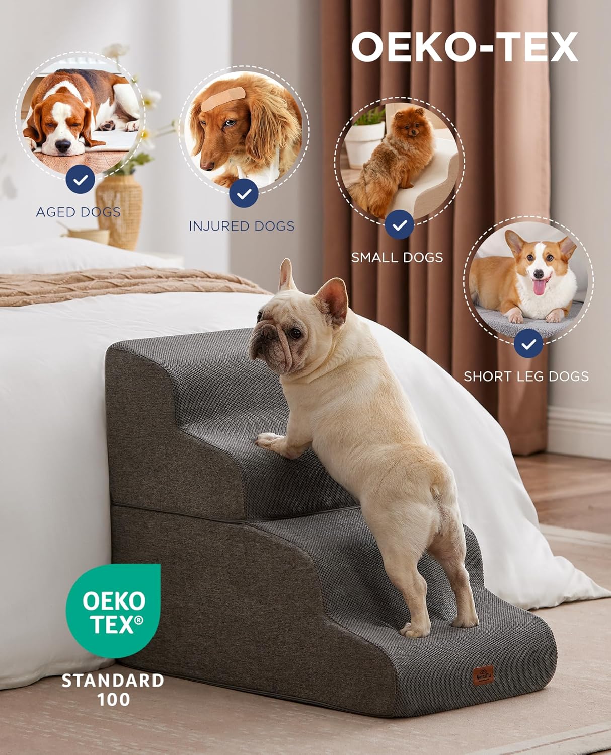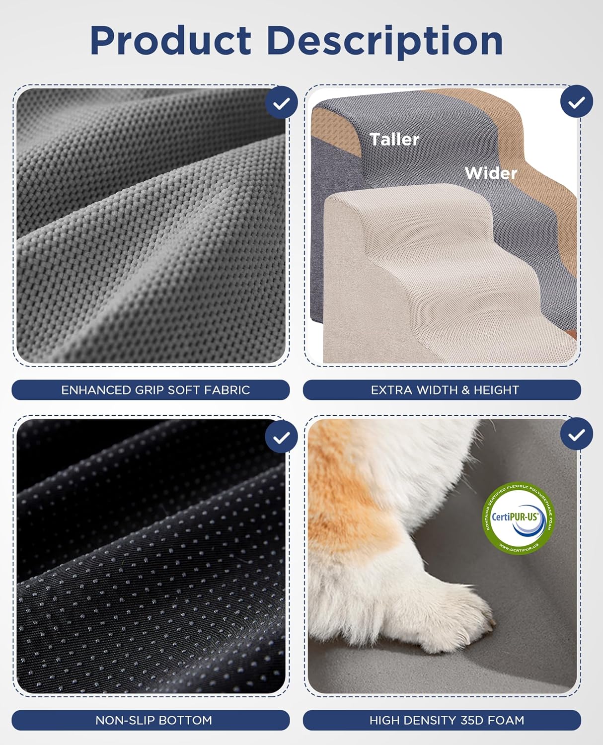 - SPECIFIC AND STEADY DESIGN - 35D density of pure foam make this stair more steady when your pets walk on. The dog bed stairs can provide strong support for pets in the walking process. Low angle slope design can better protect your pet's joints.
