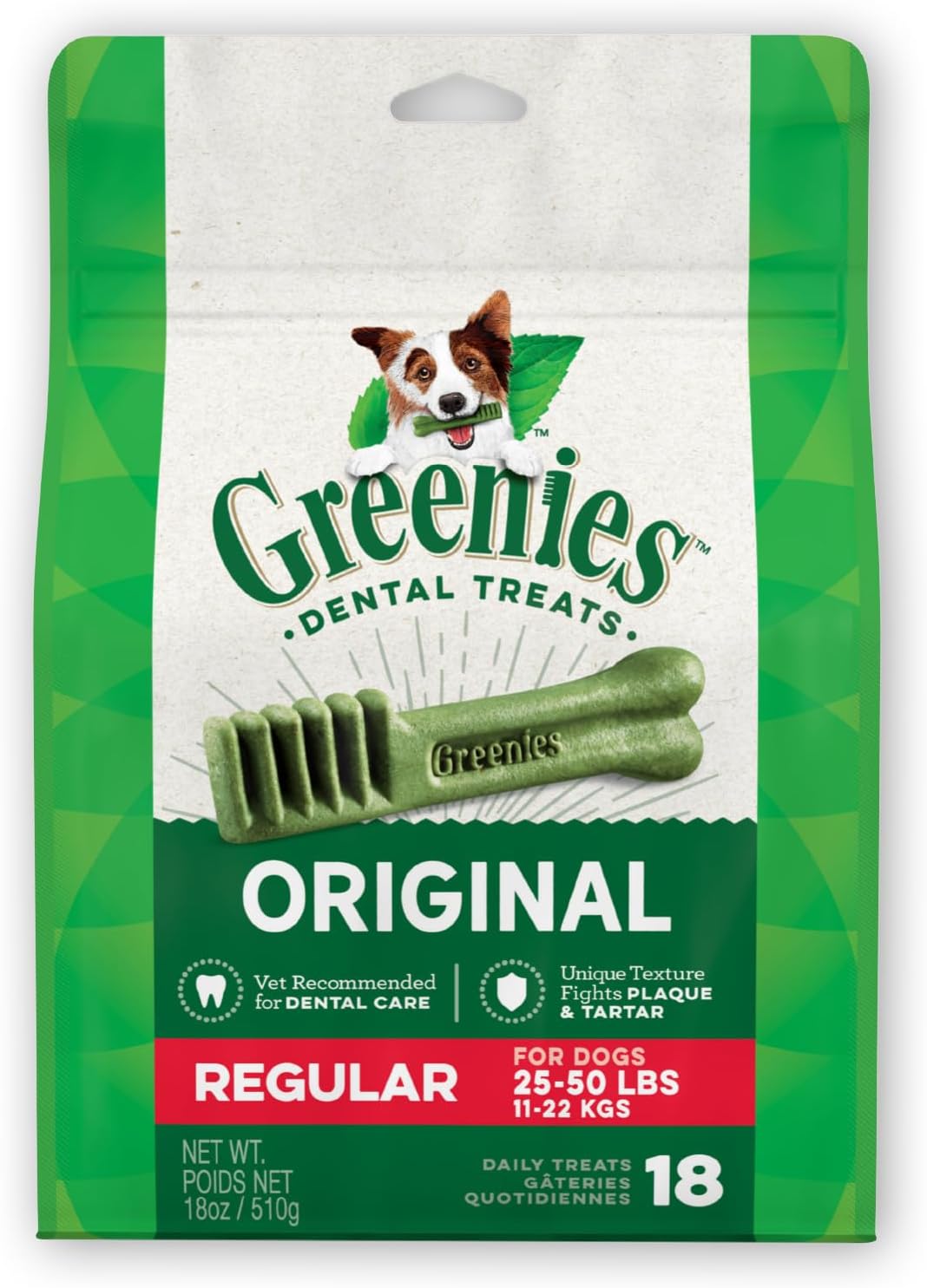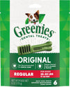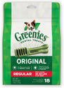 One Greenies Original Dental Treat a day is all it takes for clean teeth, fresh breath, and a happy dog. Your dog can't wait to sink their teeth into these delicious, original-flavor dental dog breath chews because they feature a delightfully chewy texture that fights plaque and tartar. Irresistibly tasty and incredibly powerful, Greenies Treats for Dogs are vet-recommended for at-home oral health care and accepted by the VOHC (Veterinary Oral Health Council.) Best of all, these natural dog breath treats are made with highly soluble ingredients that are safe and easy to digest. Give your dog the mouth-wowing treat that helps promote their overall health with Greenies Dog Treats. Natural Dog Treats Plus Vitamins, Minerals, and Other Nutrients.