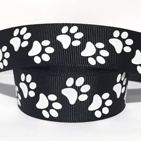 Grosgrain Ribbon 1" White Paw Prints on Black Ribbon Animal Dogs Printed - Per Yard