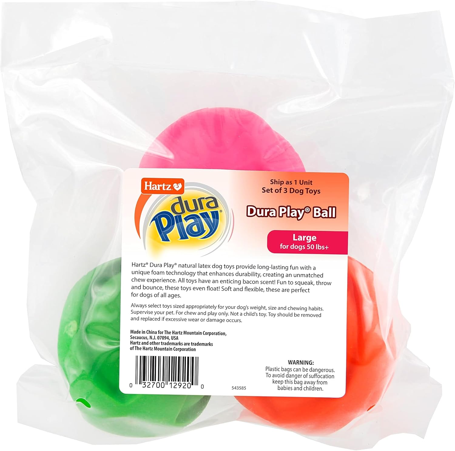 Whether your dog enjoys indoor or outdoor play, Hartz Dura Play bacon scented dog toys are the perfect addition to the toy bin. These dog toys have a durable exterior coupled with a lightweight foam interior to make it easy to throw, bounce, squeak, and float! Every shape has an ear-perking squeaker and an appealing bacon scent that will have even the most inactive dogs begging for more playtime. Dura Play dog toys are perfect for dogs of all ages – the flexible yet durable exterior lends itself to more than just a fetch toy. After your pup is worn out from his or her active play, Dura Play also has unique shapes with ridges that double as a soft chew toy. Be sure to try all the different shapes for hours of enticing play and fun for both you and your furry best friend!