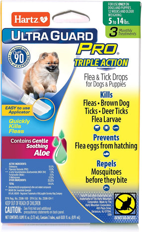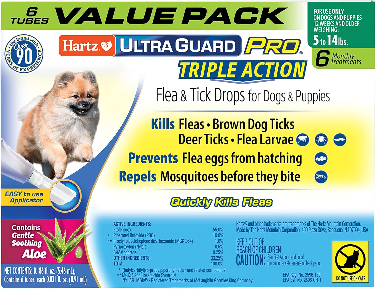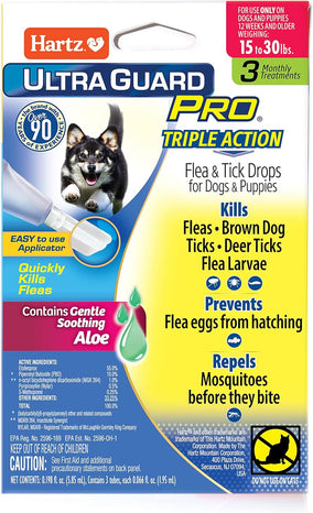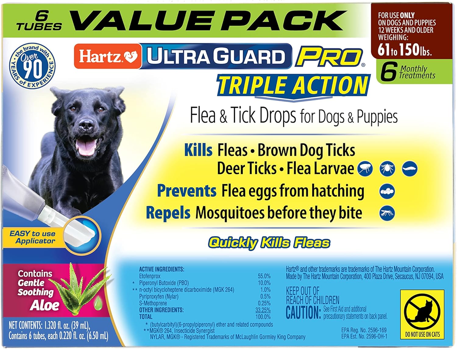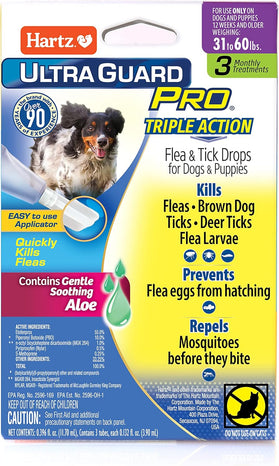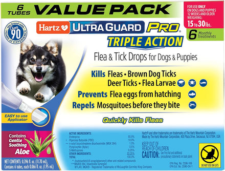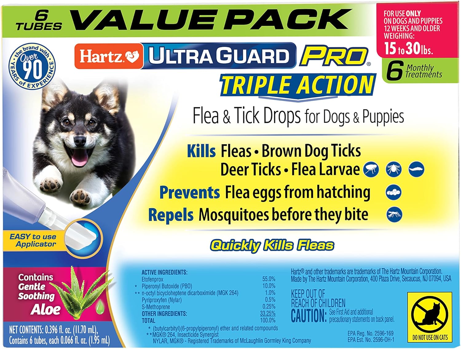 Hartz UltraGuard Pro Flea & Tick Treatment for Dogs & Puppies 61-150 lbs is a long lasting, monthly topical treatment with dual Insect Growth Regulators (IGRs) that protect your pet and his environment, and is fast-acting. This safe yet powerful formula kills fleas, brown dog and deer ticks, flea eggs and flea larvae, and repels mosquitoes before they bite—preventing re-infestations for 1 month. Features the patented and easy-to-use Pro-Glide angled applicator with rounded edges for a softer, more pleasant application experience that is suitable for both long- and short-haired dogs. Quick drying formula stays on and doesn’t rub off. Use only on dogs or puppies 61 to 150 pounds, 12 weeks of age and older. Do not use on cats or kittens. Package contains six applications—a six-month supply.
