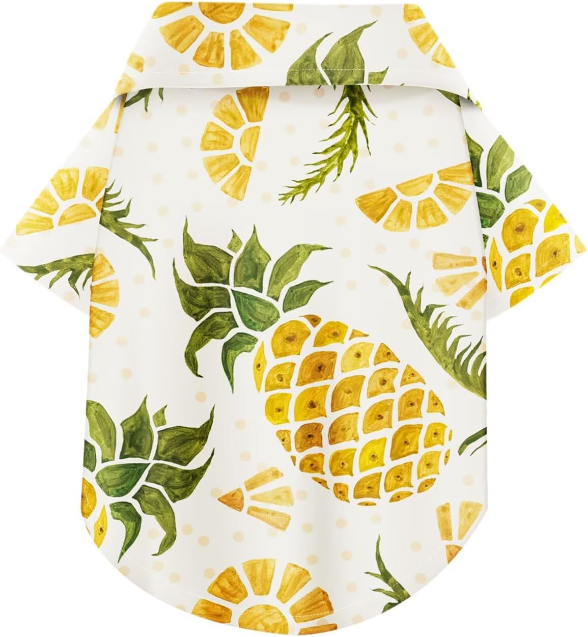 - Tropical Hawaiian Style – This dog shirt features fun pineapple prints, bringing laid-back island vibes to your pup’s wardrobe. A great choice for beach days, poolside parties, or casual summer strolls.