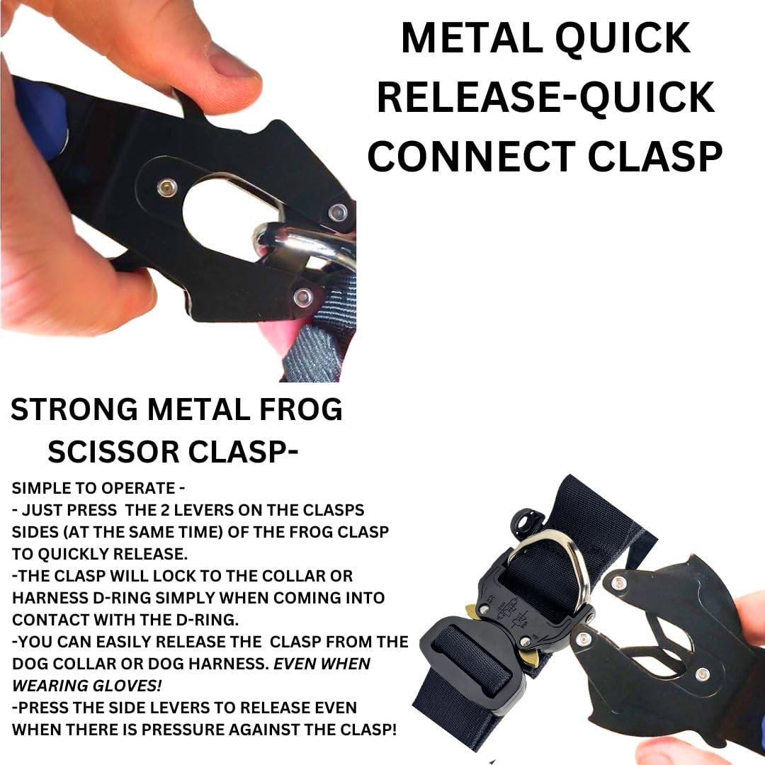 - Durable Frog Clip and Reflective Safety: Equipped with a Quick Release Easy Connect Frog Scissor Clip made of strong, lightweight metal, this leash ensures a secure connection for powerful pullers. Reflective stitching along the length provides exceptional visibility, keeping you and your dog safe during night walks or low-light conditions.