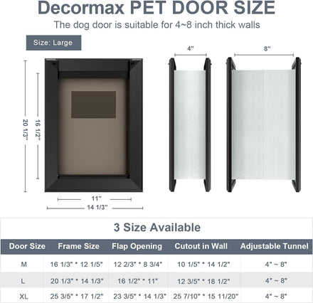 - 【Dimensions and Stretching Ranges】The dog door with the telescopic tunnel is suitable for 3 9/10-7 7/8 inch thick walls. The outer frame size of L is 20 1/3" * 14 1/3", flap opening is 16 1/2" * 11", which is suitable for dogs under 110 pounds.