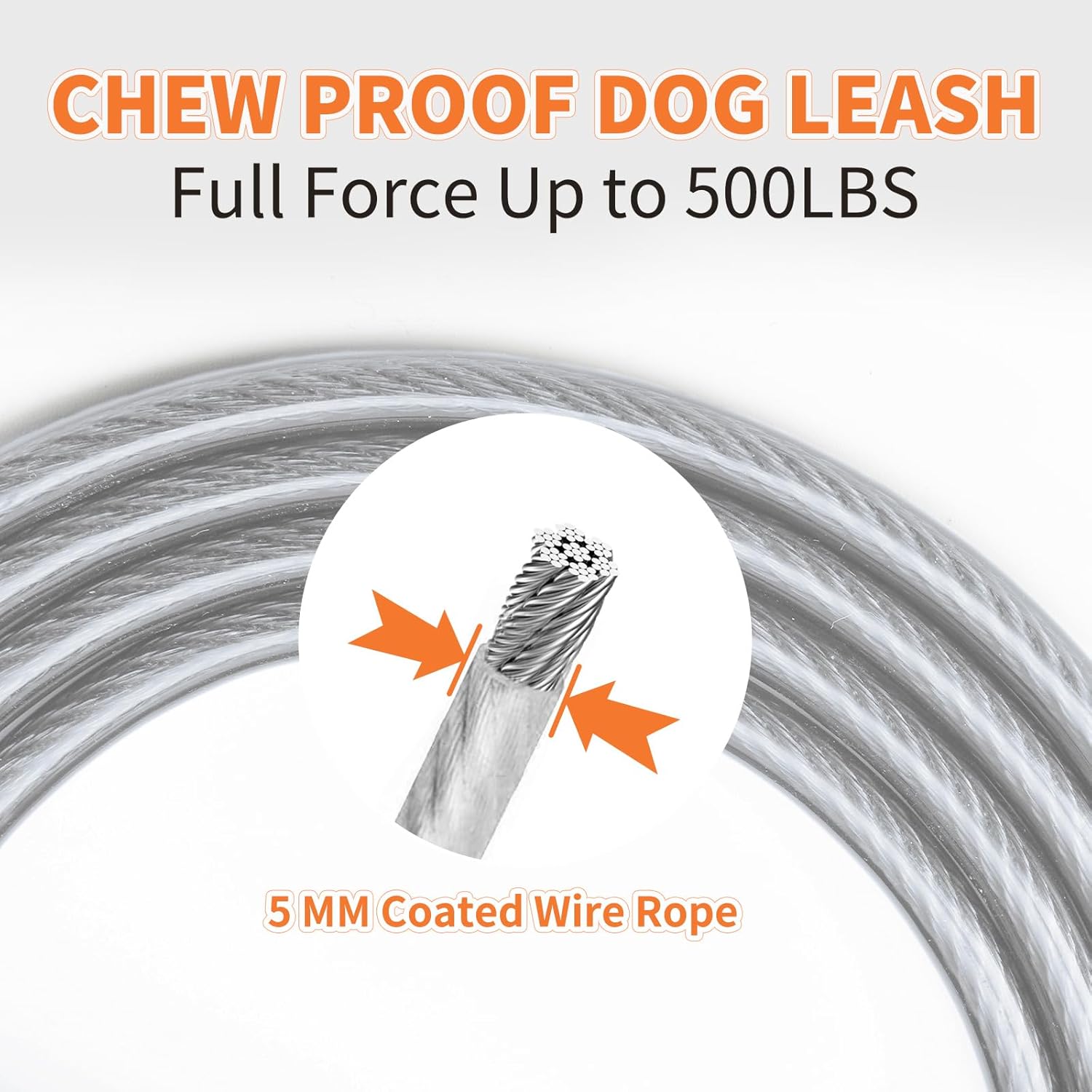 - CHEW PROOF WIRE ROPE: Our dog leash is made of 5mm stainless steel wire rope, support large dogs up to 500 LBS. Which is sturdy,enduring and resistant to chew, even by heavy-chewing puppies and those with sharp teeth