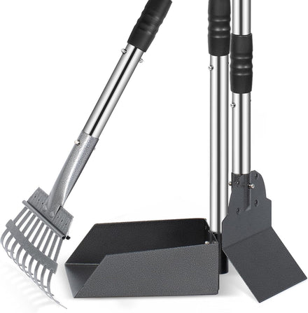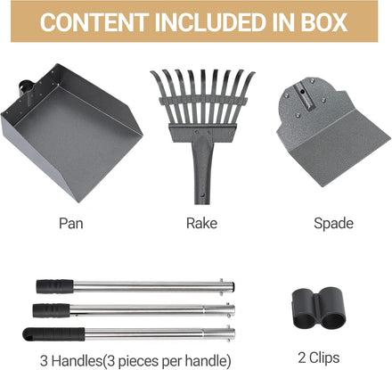 - Pooper Scooper Equipment in Pack: 1 tray, 1 spade and 1 rake kit, meet almost all the needs of using. The size is over 37 inches, you need not bend over when clean pet poop.