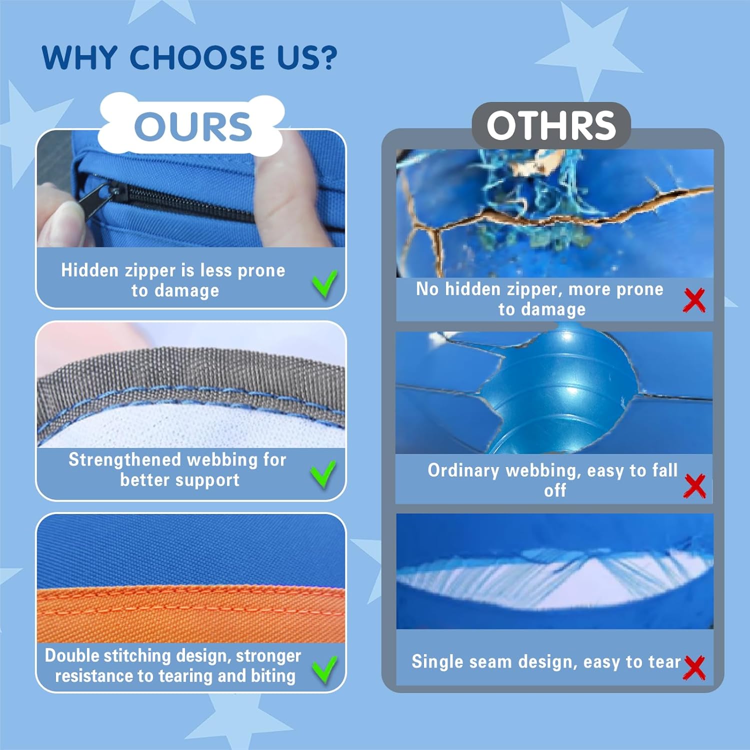 - Double stitching & hidden zipper design: In order to further enhance the tear resistance of the dog ball, we use double stitching and hidden zipper design, which can make the shell stronger and not easy to be torn by dogs.