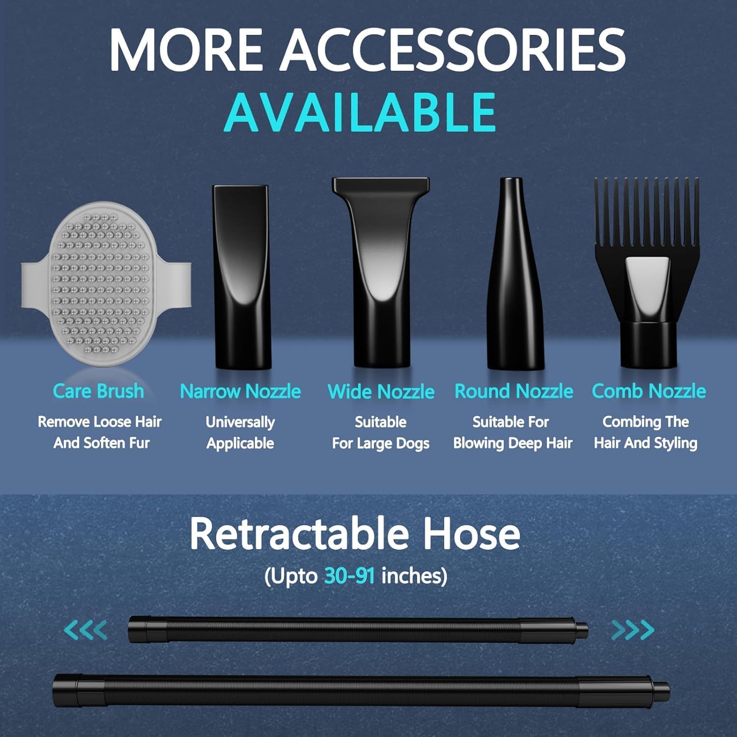 - 【Pet-Friendly Design】Featuring a durable one-piece ABS shell and advanced noise-reduction technology, this pet dryer operates at just 50-70 dB—15 dB quieter than standard dryers. The low-noise design keeps anxious pets calm, making it perfect for sensitive animals. Plus, the flexible hose extends up to 8.2 ft (2.5 m) for safe, hassle-free grooming.