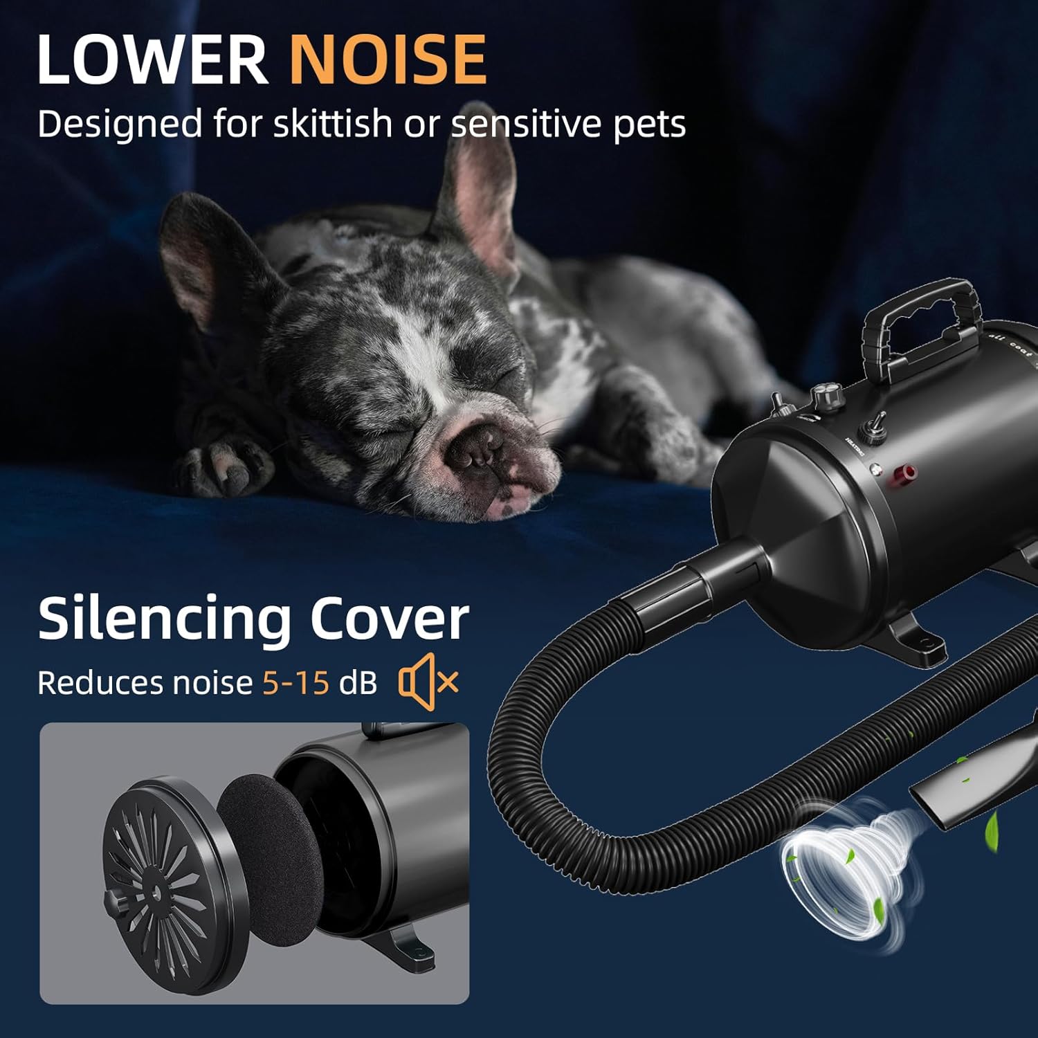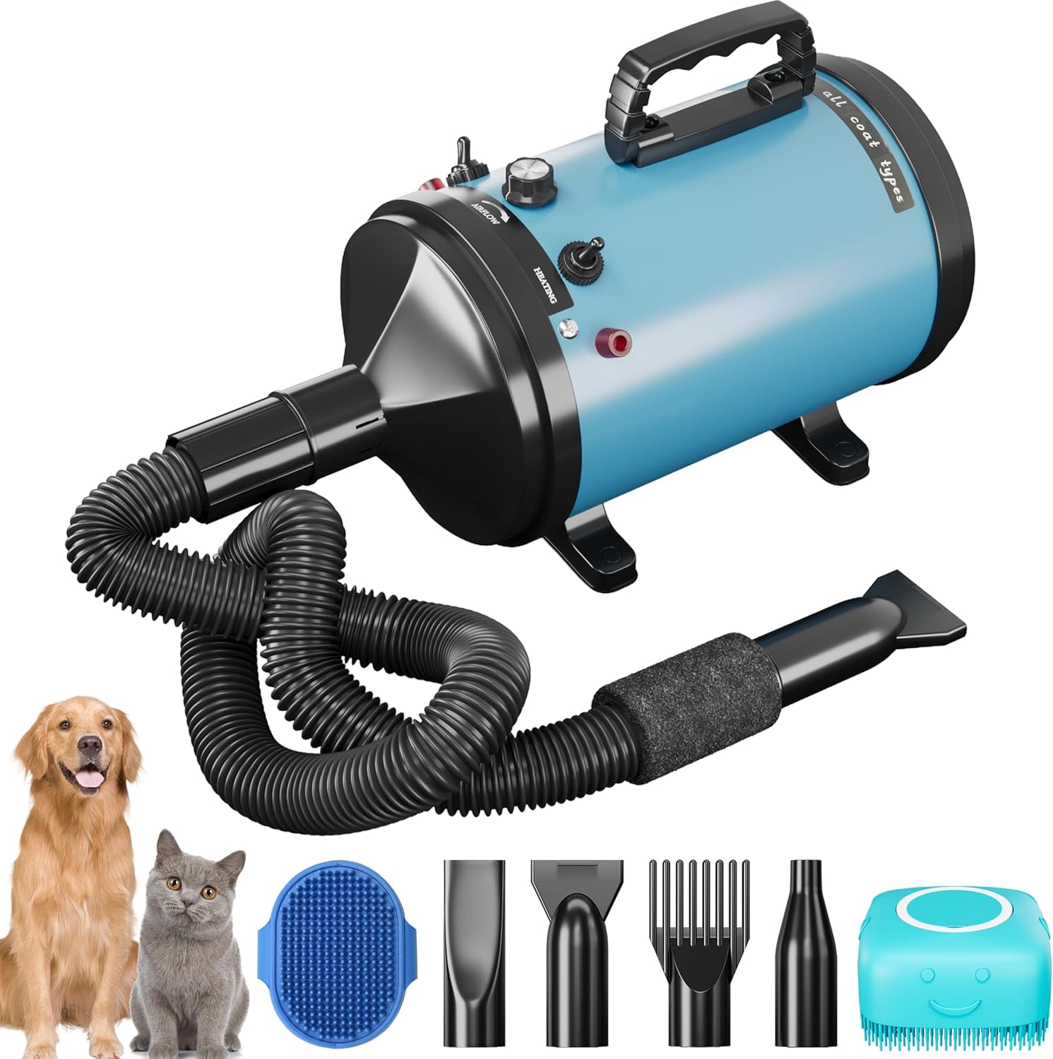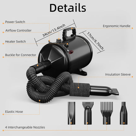 - 🐶[𝐔𝐩𝐠𝐫𝐚𝐝𝐞𝐝 𝐄𝐟𝐟𝐢𝐜𝐢𝐞𝐧𝐭 𝐃𝐨𝐠 𝐁𝐥𝐨𝐰𝐞𝐫 𝐊𝐢𝐭] Dog blow dryer kit comes with 4 interchangeable nozzles, catering to various requirements for pet blow-drying. Dries a dog's coat effectively after bathing or swimming. Help to prevent dampness, reducing potential skin issues. We also provide two pet bathing brushes, which are made of high quality soft rubber material, will not scratch your pet's skin, perfect for bathing, massaging and grooming pets with sensitive skin.