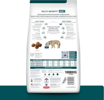 - Prescription Diet w/d Multi-Benefit is specially formulated by Hill’s nutritionists and veterinarians to helps manage multiple conditions that respond to fiber, weight & glucose management, digestive issues, and urinary health