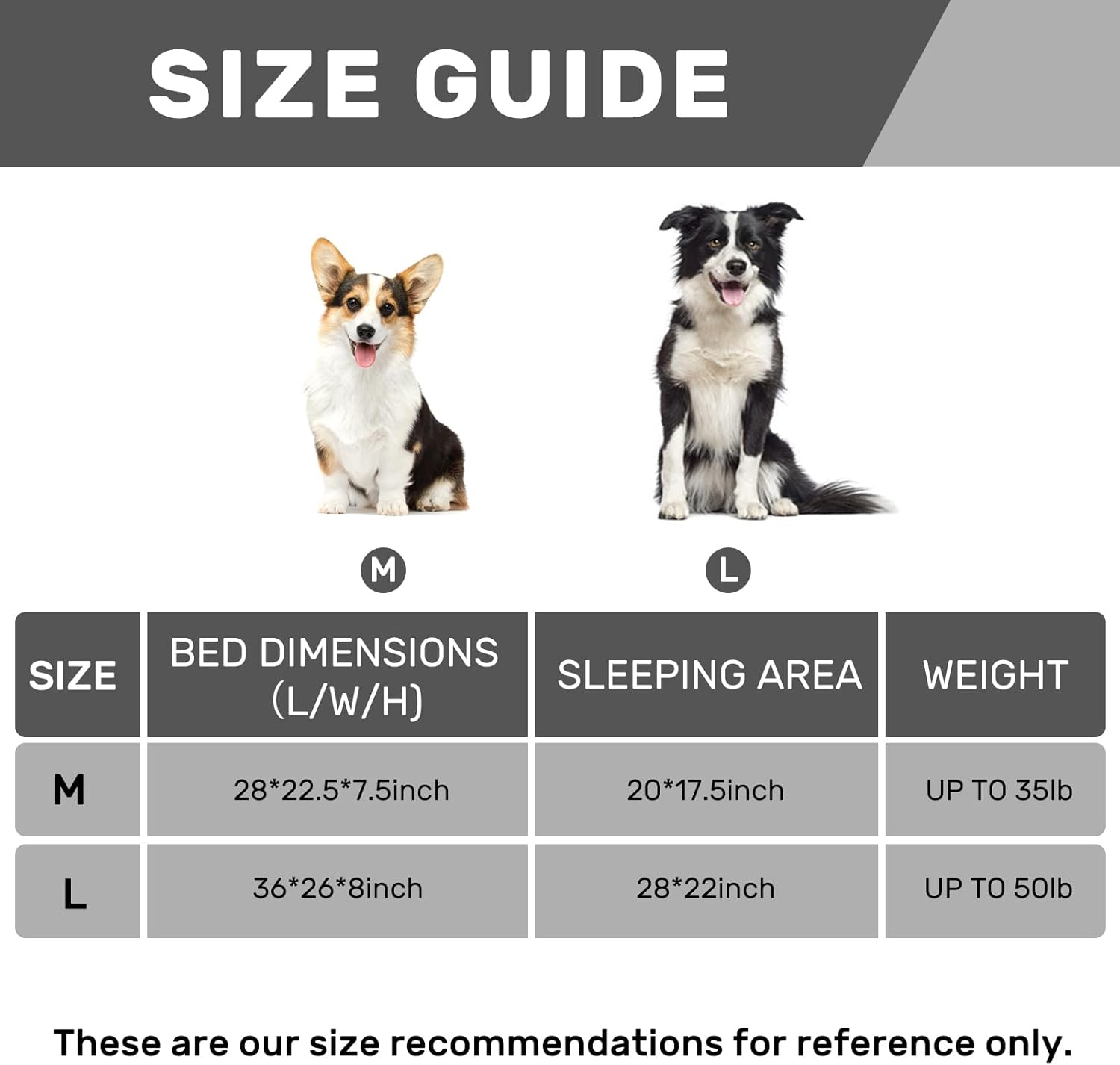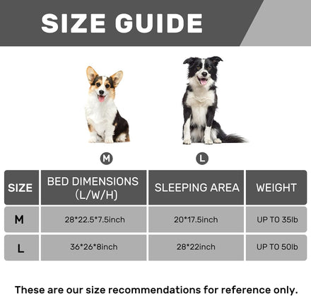 - 【Dog Sofa Size】 Medium sofa: Sofa size is 28 x 22.5 x 7.5in, sleeping area size is 20 x 17.5in, up to 35lb. Large sofa: Sofa size is 36 x 26 x 8in, sleeping area size is 28 x 22in, up to 50lb
