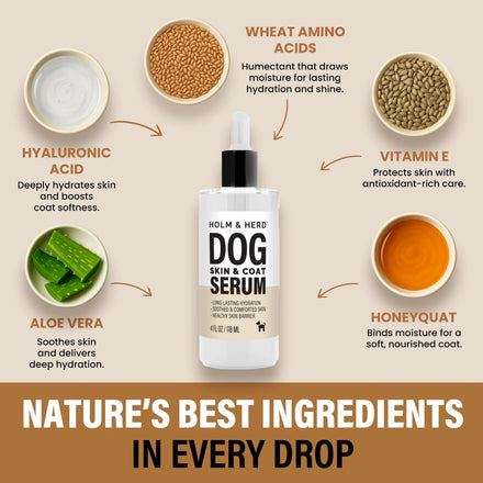 - Unscented Skin & Coat Serum – Lightweight daily serum nourishes and protects with plant-based oils. Ideal for sensitive pups needing moisture without added fragrance.