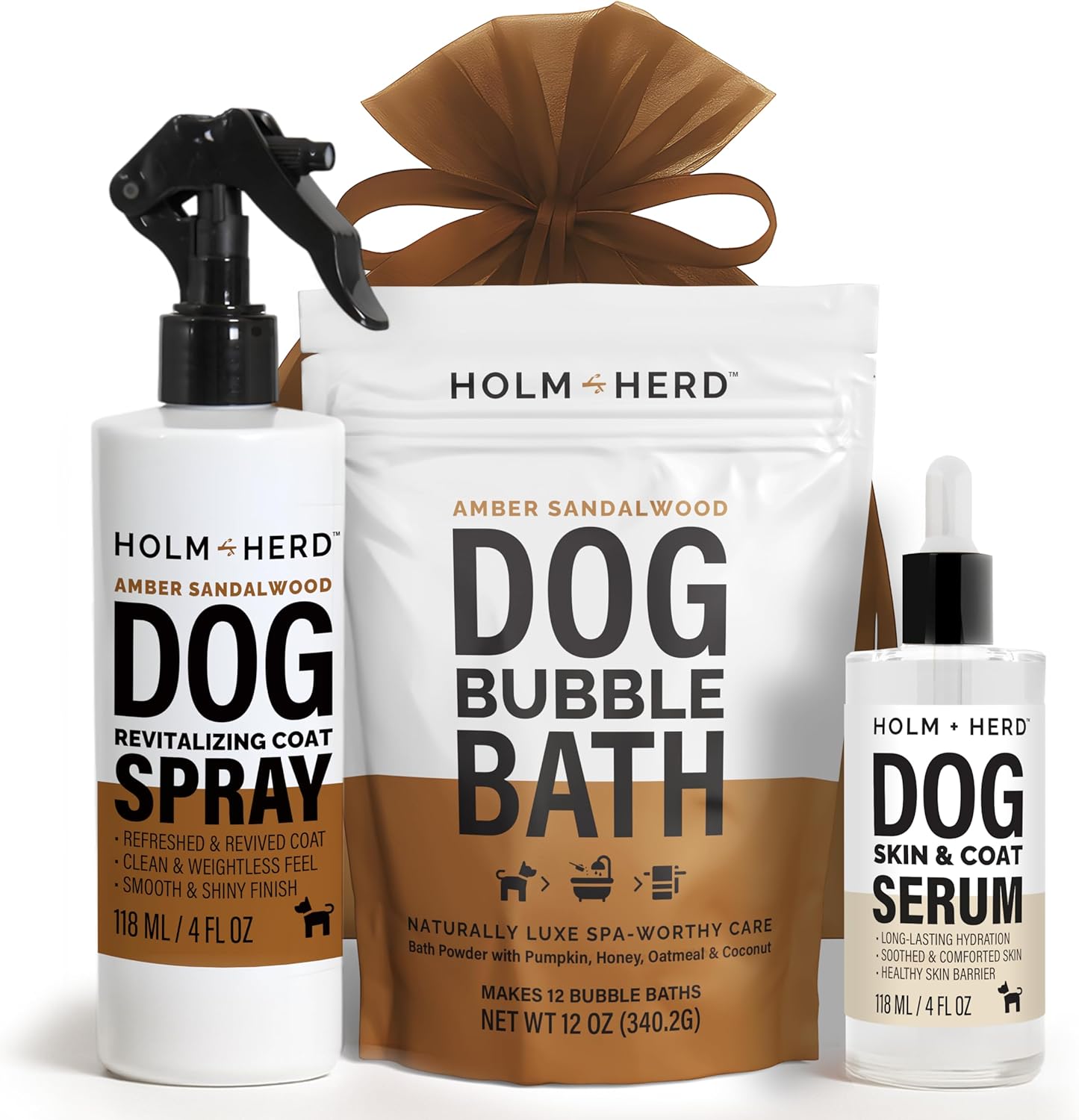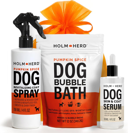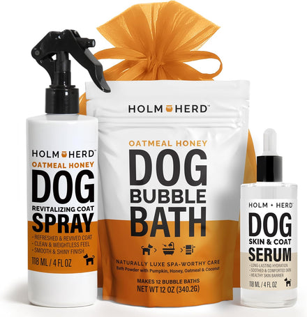 - 3-Piece Luxury Dog Grooming Kit – Includes Oatmeal Honey Bubble Bath Powder, Refreshing Coat Spray, and Unscented Skin & Coat Serum, all packed in an elegant gift bag.