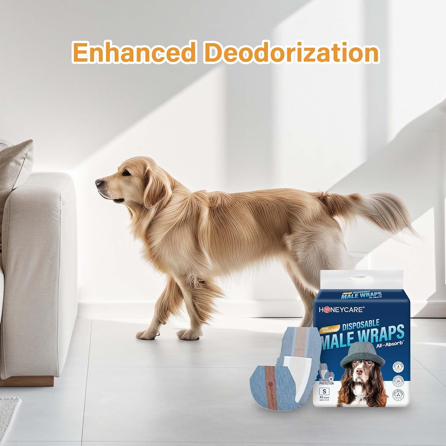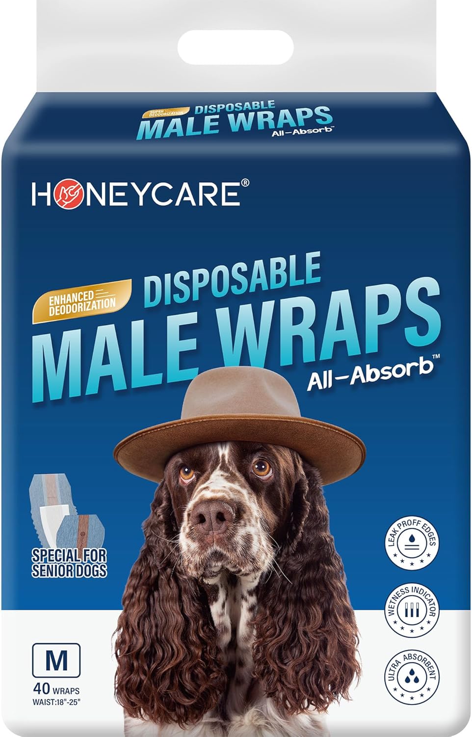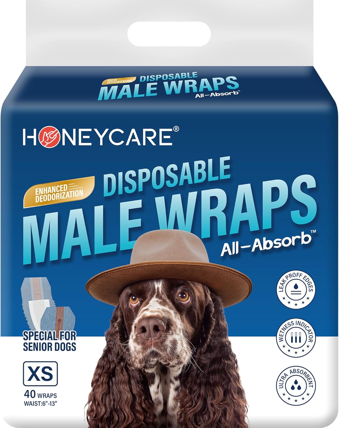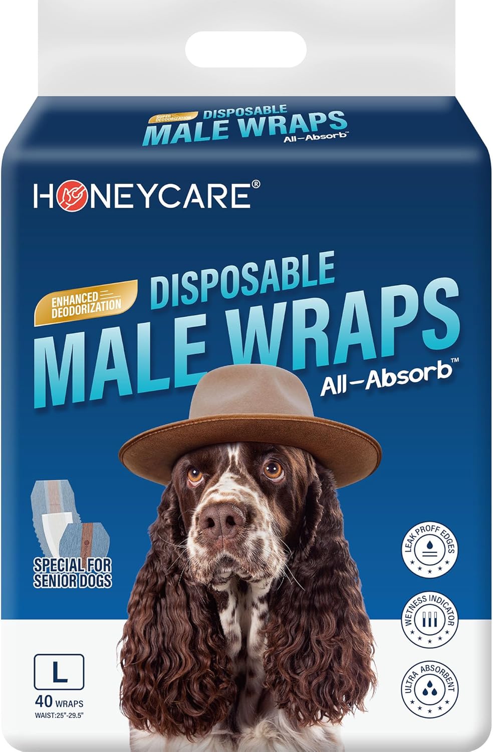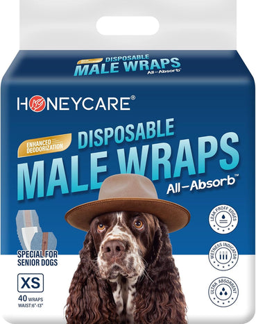 - DRY AS A BONE - Honeycare Male Wraps for Senior Dogs have 360 degree leak-proof protection barriers, and a super absorbent core which prevents any unwanted spills