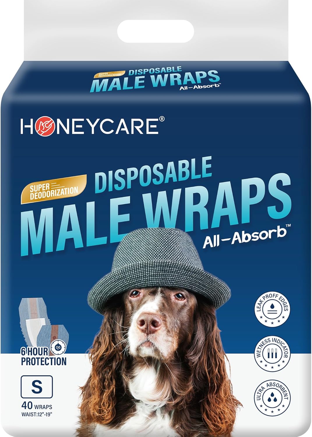 WRAP IT UP- Honeycare Male Wraps are designed to fit: -Large-sized dogs with a 25 - 29.5 inch waist; -Medium-sized dogs with a 18 - 25 inch waist; -Small-sized dogs with a 12 - 19 inch waist; XS-sized dogs with a 6 -13 inch waist. These are guaranteed to keep your little buddy comfy and dry, while helping you maintain peace of mind.