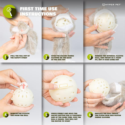 BATTERY OPERATED PROLONGED PLAY – To change batteries, remove the plastic ball from plush toy cover. Use tab to open the giggle dog toy ball. Remove the battery compartment and insert 3 AAA batteries. This interactive dog toy has an automatic stop feature after a period without use to extend battery life. (Batteries are included with the Hyper Pet Doggie Tail)