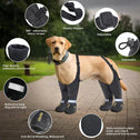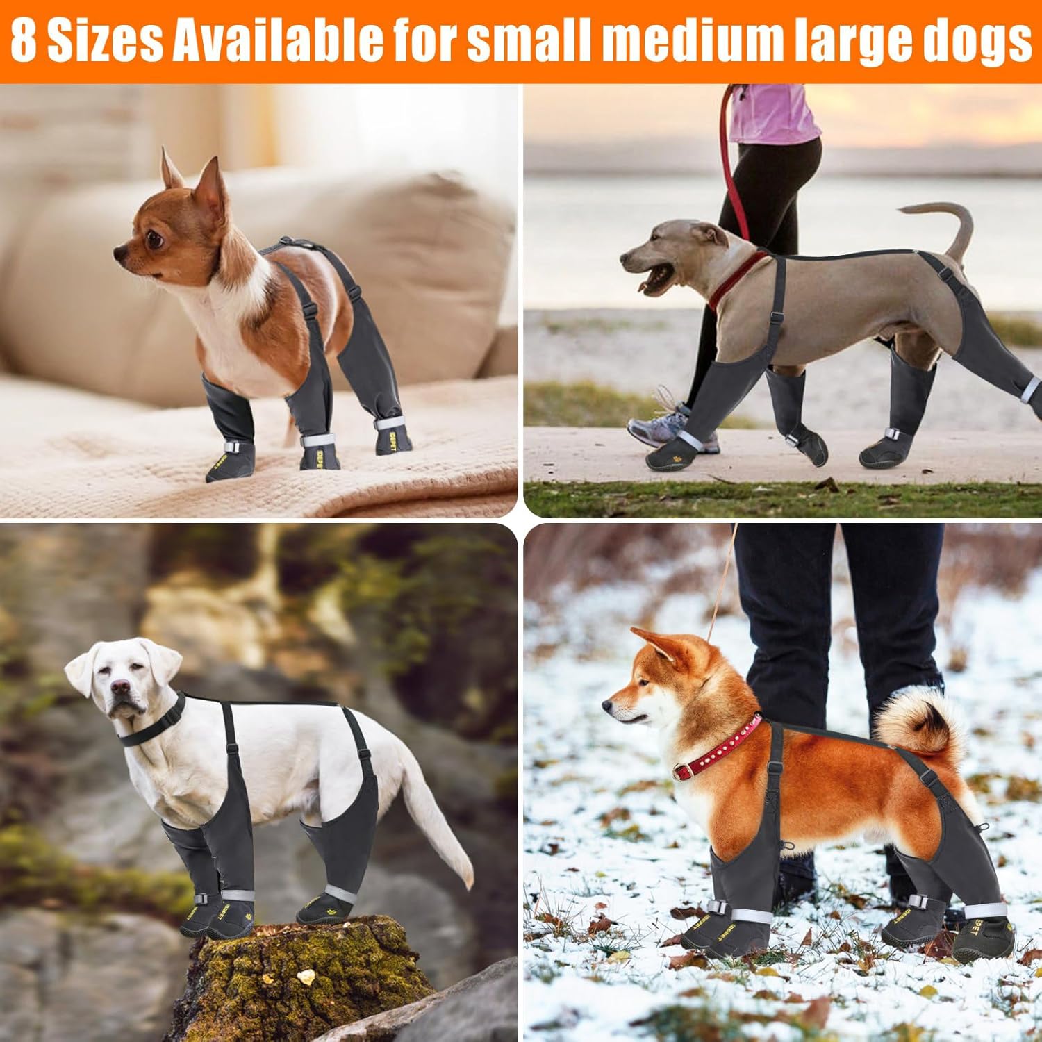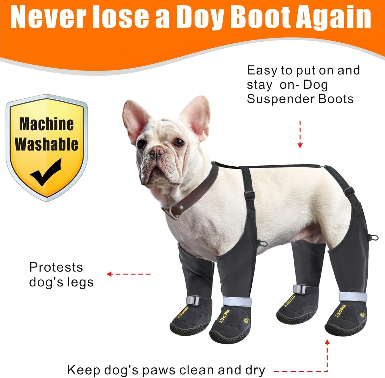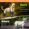2025 UPGRADED DOG BOOTS : This newly upgraded dog boot suspenders ensures that the dog boots stay securely on your dog's feet without slipping off during walks: fits your dog's paws durable sole; cute pet paw embroidery, doggy boots shoes with adjustable straps on the back and straps on the ankle and elastic pull rings for maximum comfort and stability. The extended leg coverage and sturdy belt straps ensure that your dog won’t lose a boot during your adventures! this dog shoes suspenders will be the best choice for your dog in winter and hot pavement.