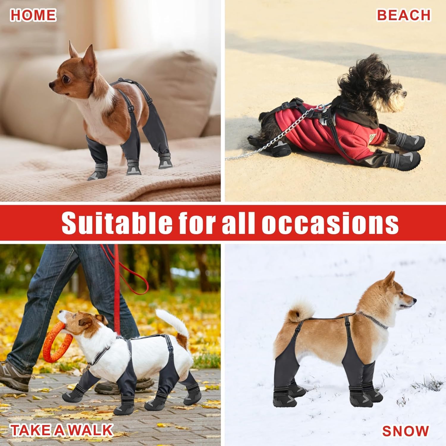 【Anti - Lost Assurance】: Our dog suspender boots are designed with adjustable straps. All 4 leggings connect together to ensure that the dog boots don't slip off and won't get lost. Suitable for all seasons, it protects dog's paws from hot pavement in summer and snow, salt and cold temperatures in winter.